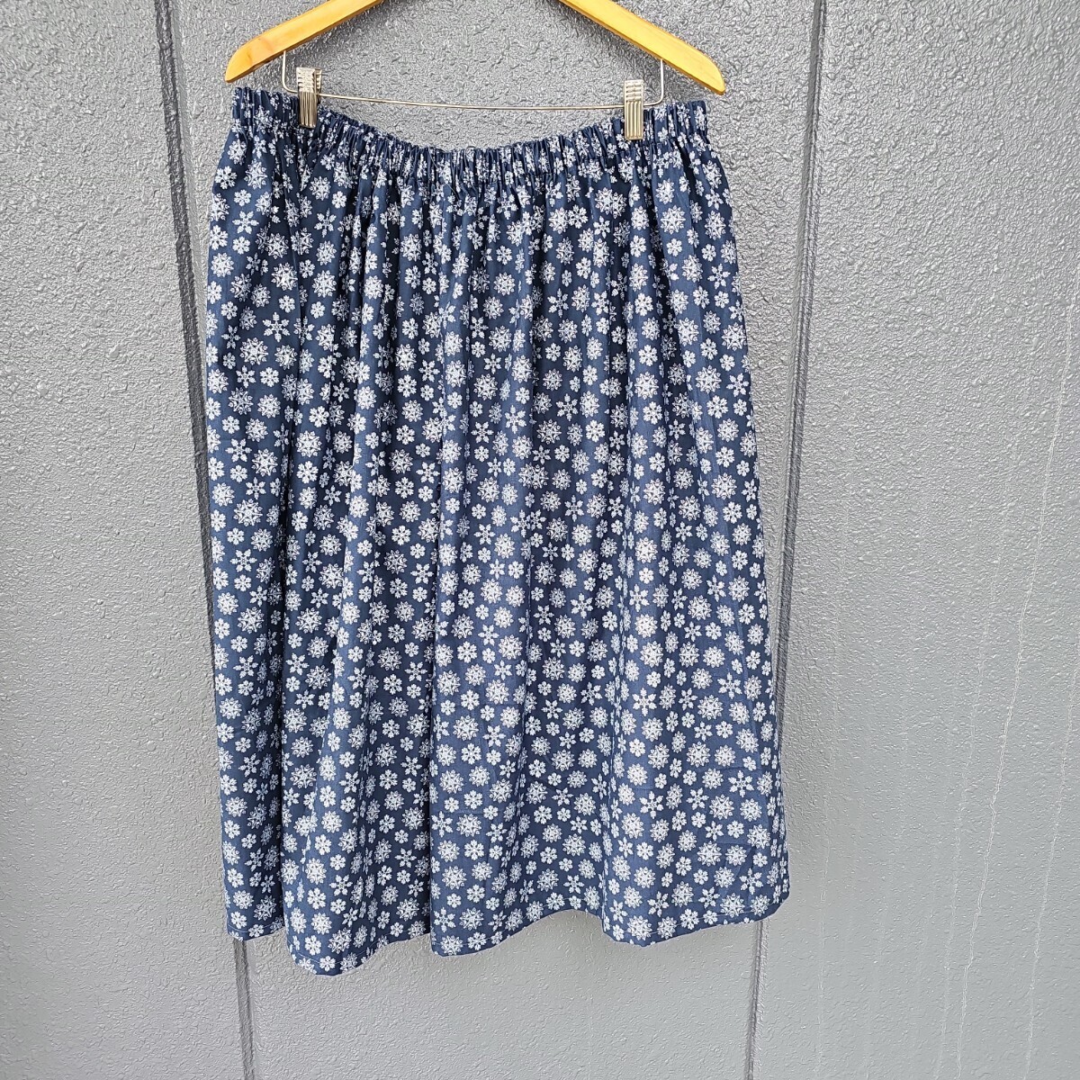 出来上がりサイズは平置きで、ウエスト(総ゴム)33cm、ヒップ108cm、裾幅54cm、総丈(ゴム部含めて)78cm、股上38cmです。