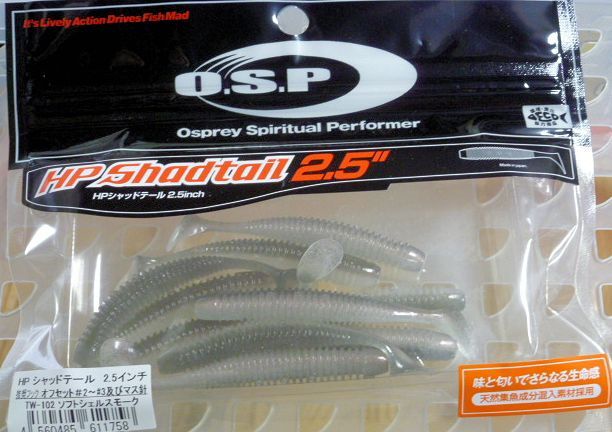 HPシャッドテール2.5inはただ巻きとシェイキングの両立を大前提にさまざまなリグに対応できる小型シャッドテール系ワームとして開発をスタート。このサイズのシャッドテールワームに不足しがちなパワフルな振動と水押しをスローからファーストまで、リトリーブスピードを問わず生み出せる。ノーシンカー(オフセットフック#2~#3)やジグヘッドリグにおけるただ巻きではヘッドまで揺らす力強いウォブリングアクションを発生。ダウンショットやネコリグでのシェイキングアクションではロッドワークに合わせてテールが力強く震えて水を押す。さらにキャロライナリグやスモラバのトレーラーにも対応。04シンクロの1.2gという最軽量クラスのウエイトでも、フリーフォールで確実にテールを振る。特筆すべきは2.2gのネイルシンカーを使ったネコリグだ。0.3g程度のシンカーを入れてスイミングもいいが、2.2gのシンカーで素早く落とす、リアクションネコリグというシークレット的な使い方もできる。HighPerformanceとHigh Pitch。この頭文字をとってHPシャッドテールと名づけたのだがその名に恥じないハイパフォーマンスな性能を発揮。年々IQのレベルを上げていくクレバーなバスも、確実に食わせられる・・・by並木敏成