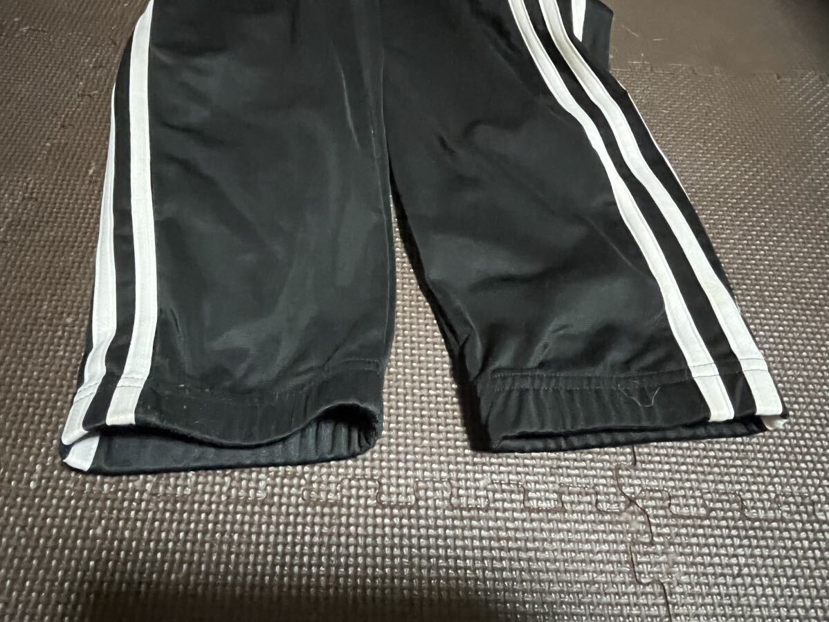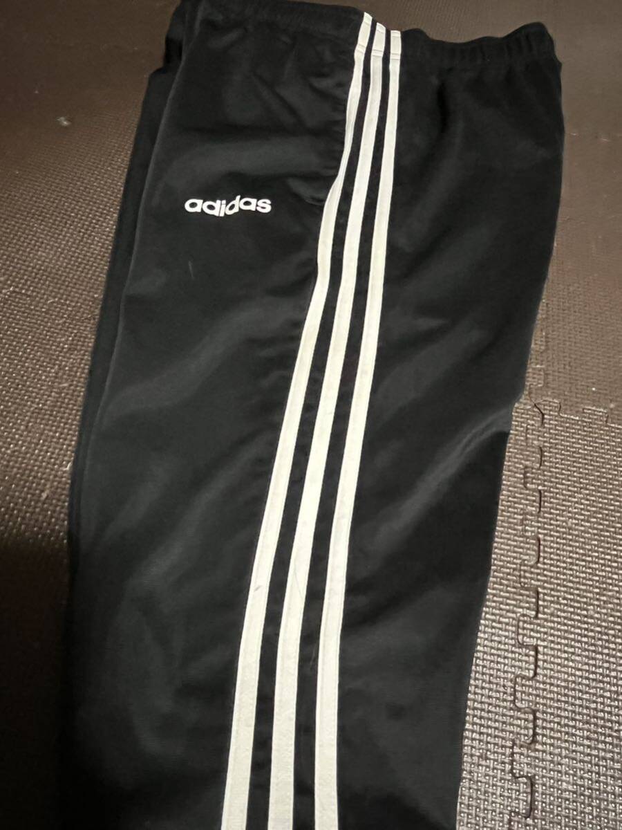美品adidas黒、ロゴ白、ライン白3本ウォーマーストレッチパンツ