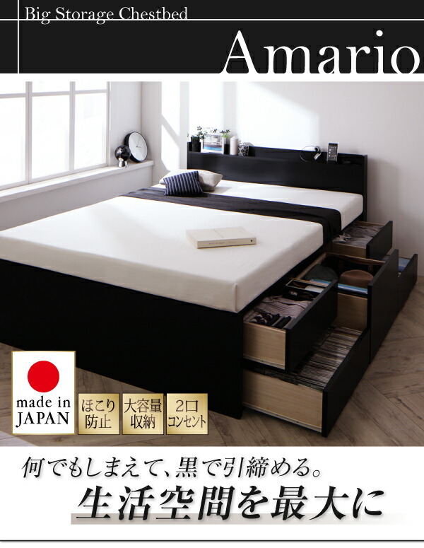 お客様組立 棚・コンセント付き_大容量チェストベッド Amario アーマリオ 薄型プレミアムボンネルコイルマットレス付き ダブル【フレームカラー:ブラック】です。