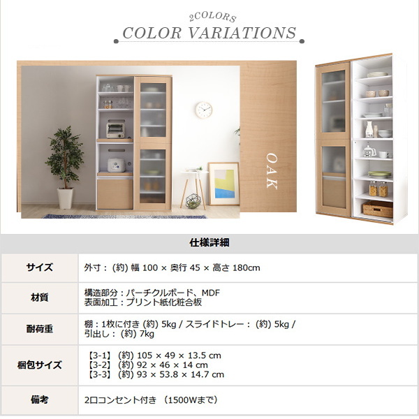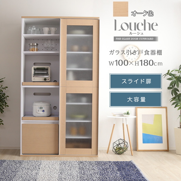ガラス引戸食器棚 幅100cm ガラスのスライドドアタイプ オーク色 ルーシュ 食器収納棚 家電収納棚 ダイニングボード 組立品 ①