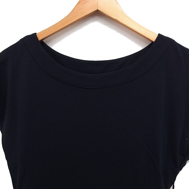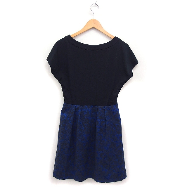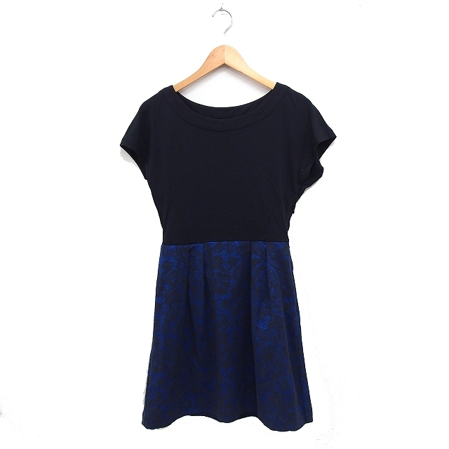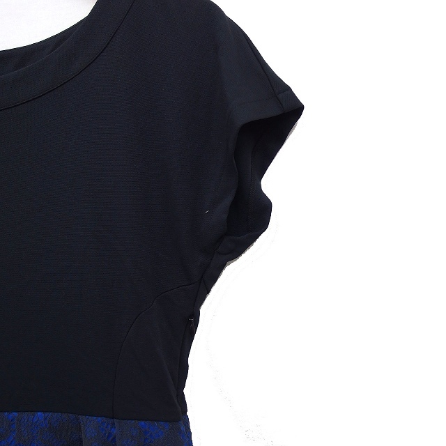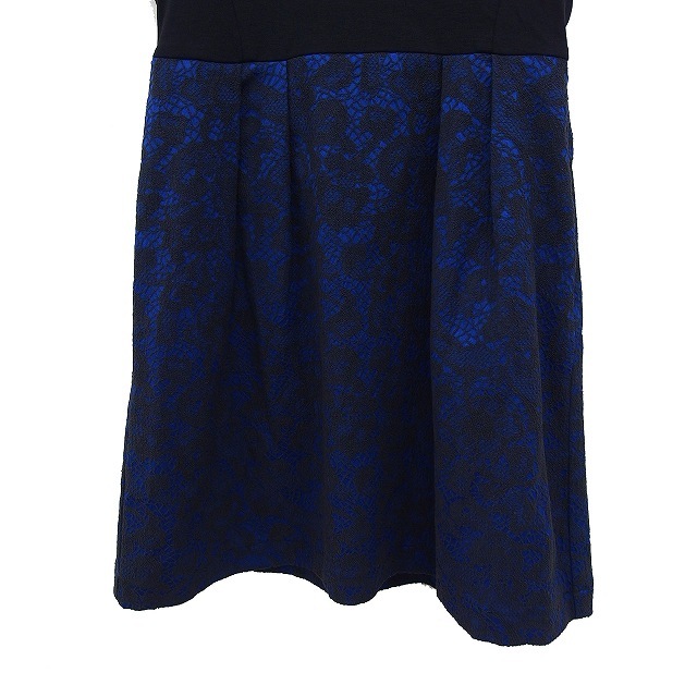 ナチュラルビューティーベーシック 切替 フレア ワンピース フレンチスリーブ ひざ丈 ジャガード M ブラック 黒 ブルー 青 /FT レディース