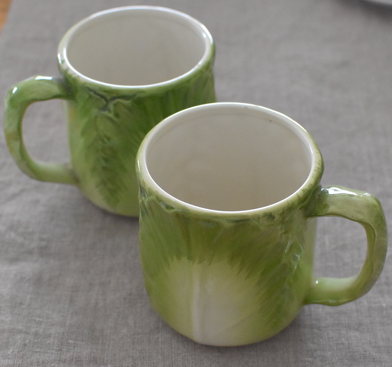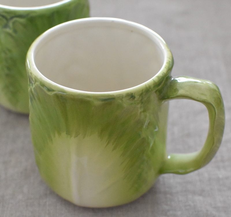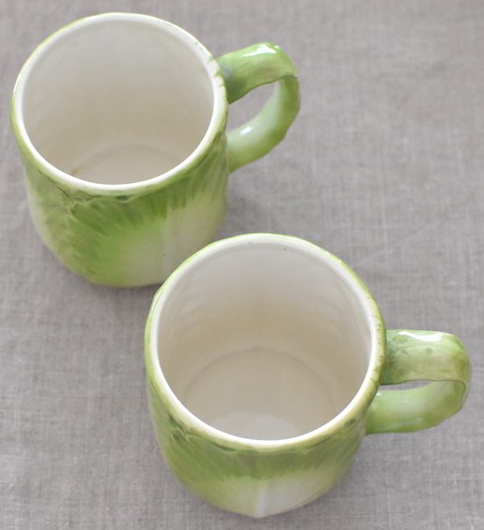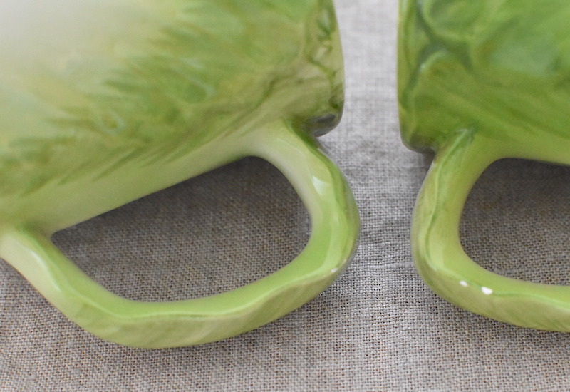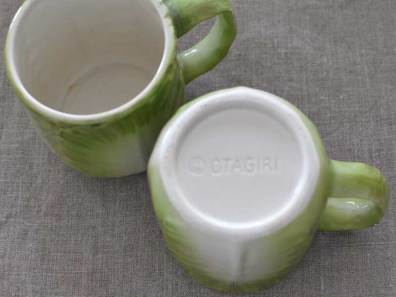 キャベツの形をしたユニークなマグカップです。2個セットで。底面に「(C) OTAGIRI」と刻印があります。OTAGIRIは国内ではあまり知られていませんが、戦後、欧米向けに動物の姿などのユニークな形状のポットやその他の食器を製造、販売していたメーカーらしく、現在でも欧米を中心にコレクターの方も多いです。手彩色のため一点一点で風合いが異なります。