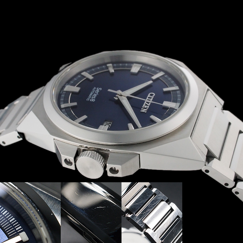 備考:爽やかなブルーフェイスにシルバーカラーの針とバーインデックスが配された「シリーズ8 831メカニカル」。ブレスレット全体にスレ傷が見られますが、艶やかで面の美しさが際立つ8角形状のケースにシンプルなデザインでオンオフ問わずお使い頂けるアイテムです。