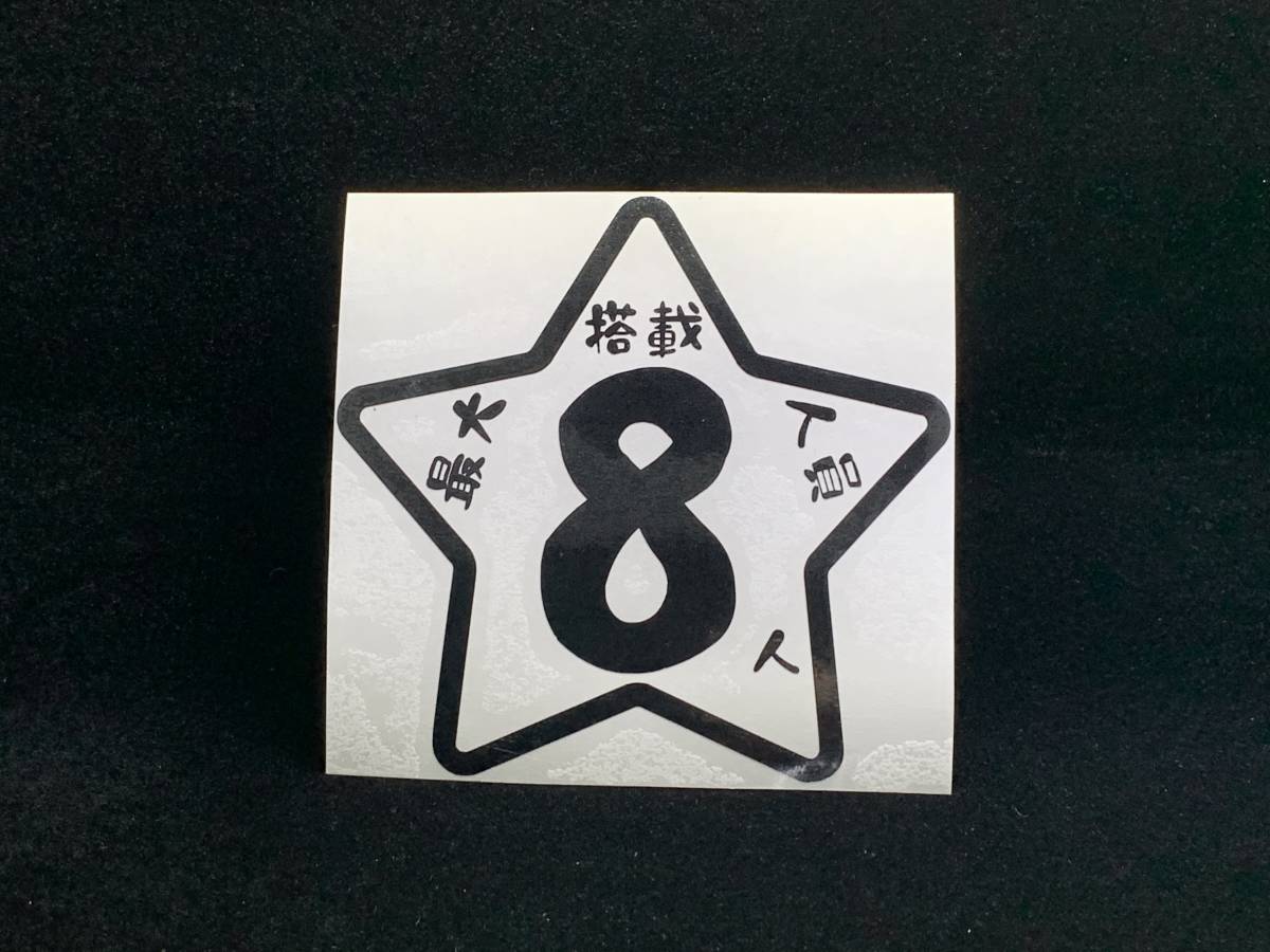 ・最大搭載人員ステッカー(船、ボート、ヨット、水上バイク等) カッティングステッカーですので枠と文字だけのタイプです。 文字名 :最大搭載人員8人(品番:STJ8-BZK) 文字色 :ブラック 文字パターン :星K ステッカーサイズ:約110mmx約105mm 用途 :屋外長期耐候用ステッカー(一流メーカーシート) 数量 :1枚 船舶の船舶検査証に記載されている人数のステッカーをお選びください。 他にもデザインの違うステッカーを出品しておりますのでマイオークションよりご確認ください。