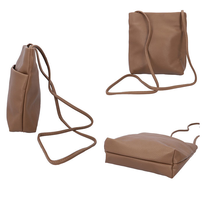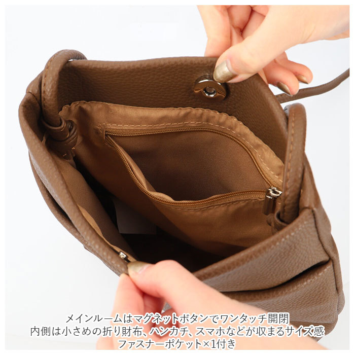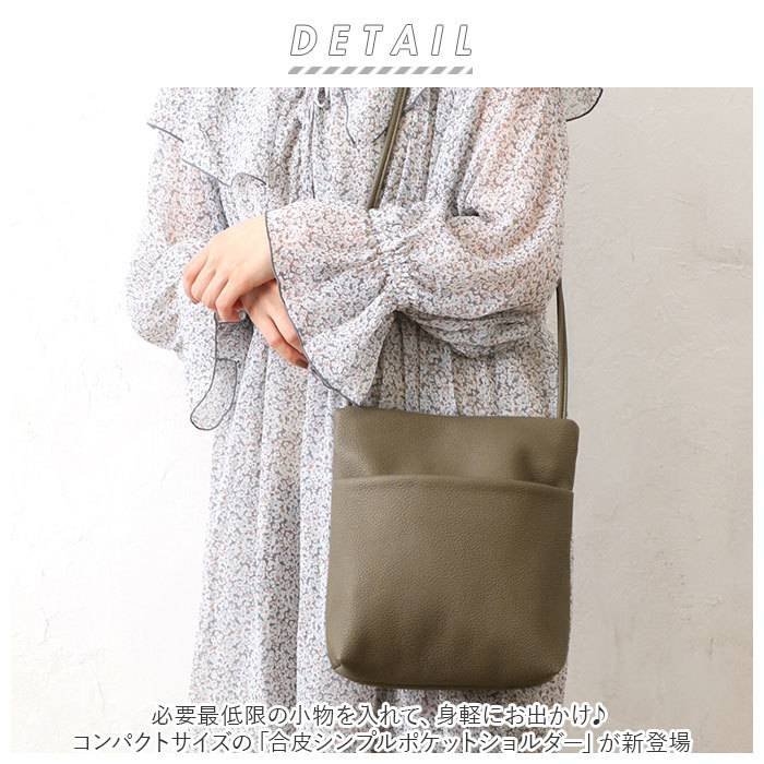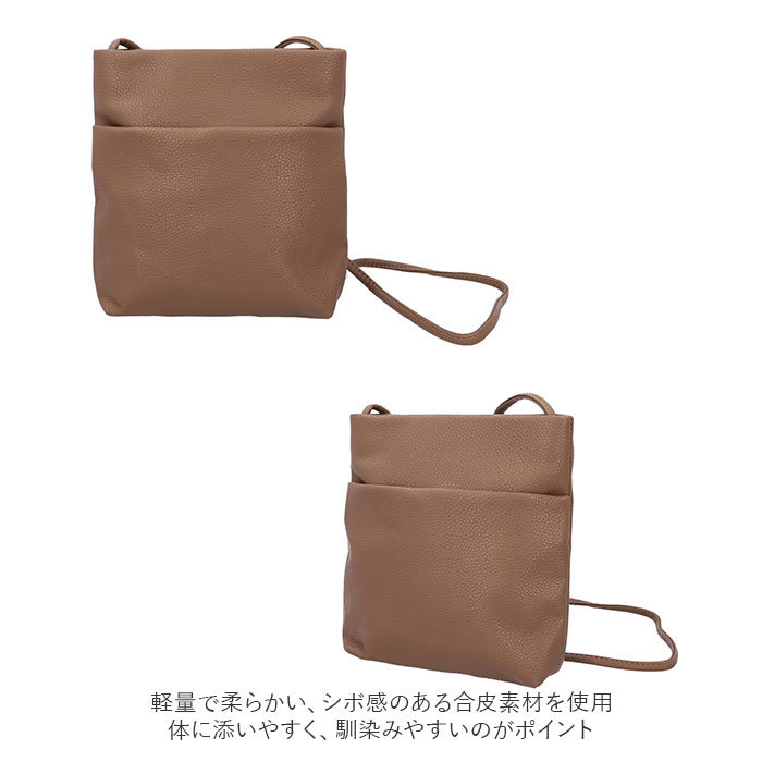 商品説明 | ・・必要最低限の小物を入れて、身軽にお出かけ♪コンパクトサイズの「合皮シンプルポケットショルダー」が新登場。 ・軽量で柔らかい、シボ感のある合皮素材を使用。体に添いやすく、馴染みやすいのがポイント。 ・メインルームはマグネットボタンでワンタッチ開閉。 ・内側は小さめの折り財布、ハンカチ、スマホなどが収まるサイズ感。ファスナーポケット×1付き。 ・フロントに大きめのオープンポケットを配置。 ・ショルダーは結んで長さ調節が可能。肩掛け・斜め掛けもOK。 ・コーディネートを選ばないシンプルなデザイン◎ |