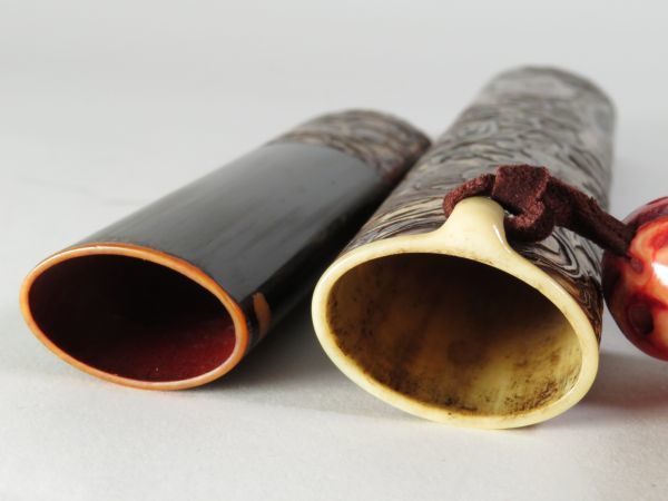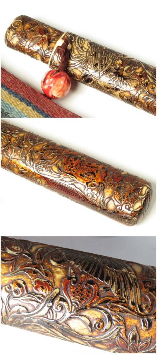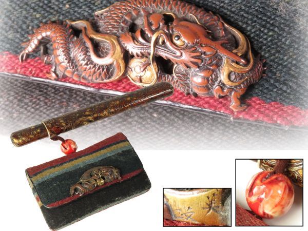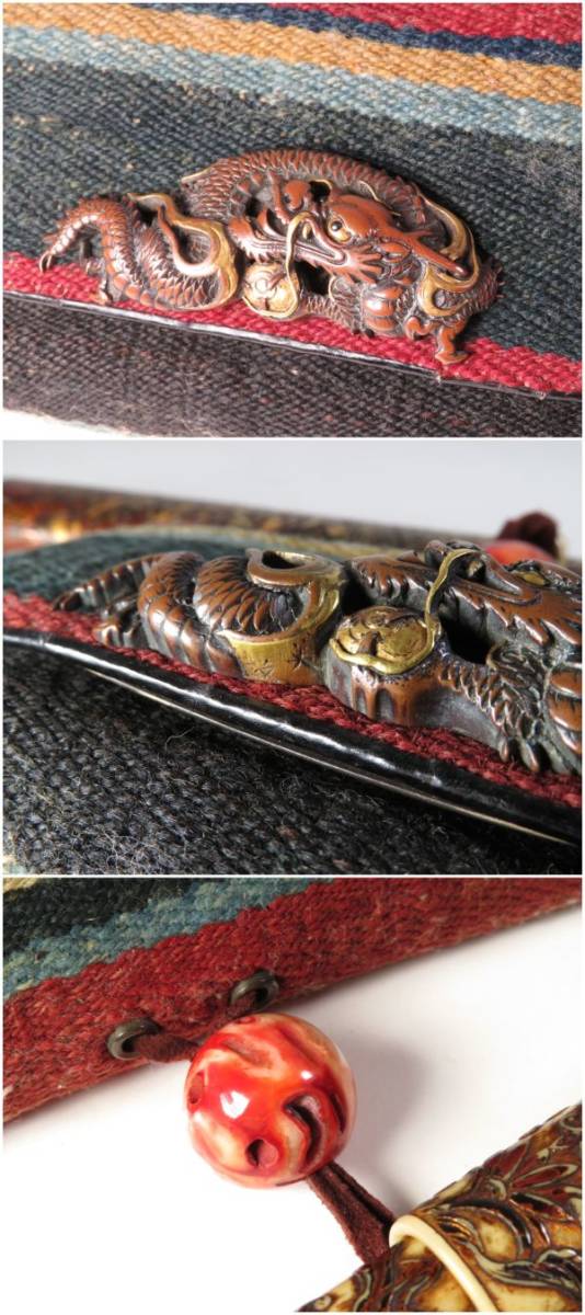 ●明治時代 牙 彩色密彫筒 〈鶴頭緒締め〉銅龍前金具 在銘になります。古い物ですが極力状態の良い作品を出品しておりますので是非ご覧ください。