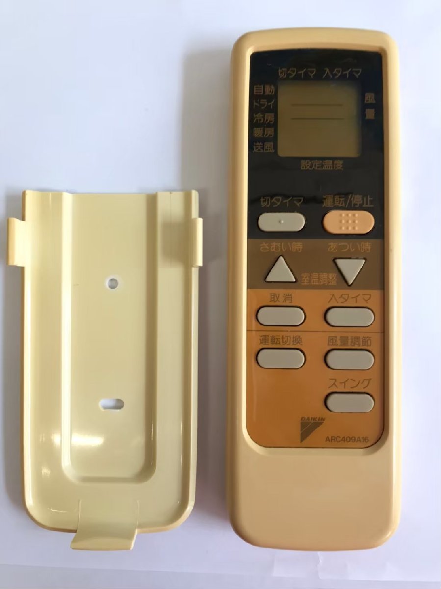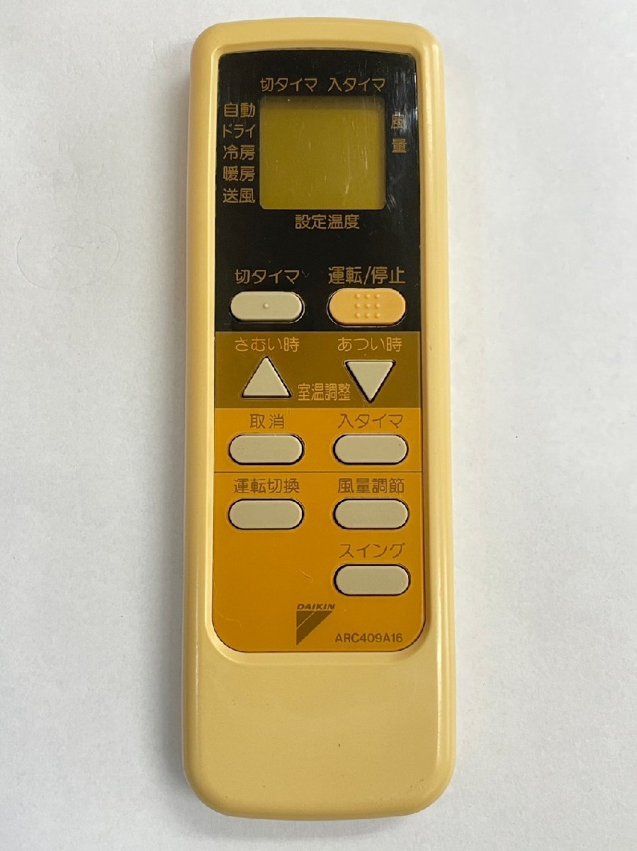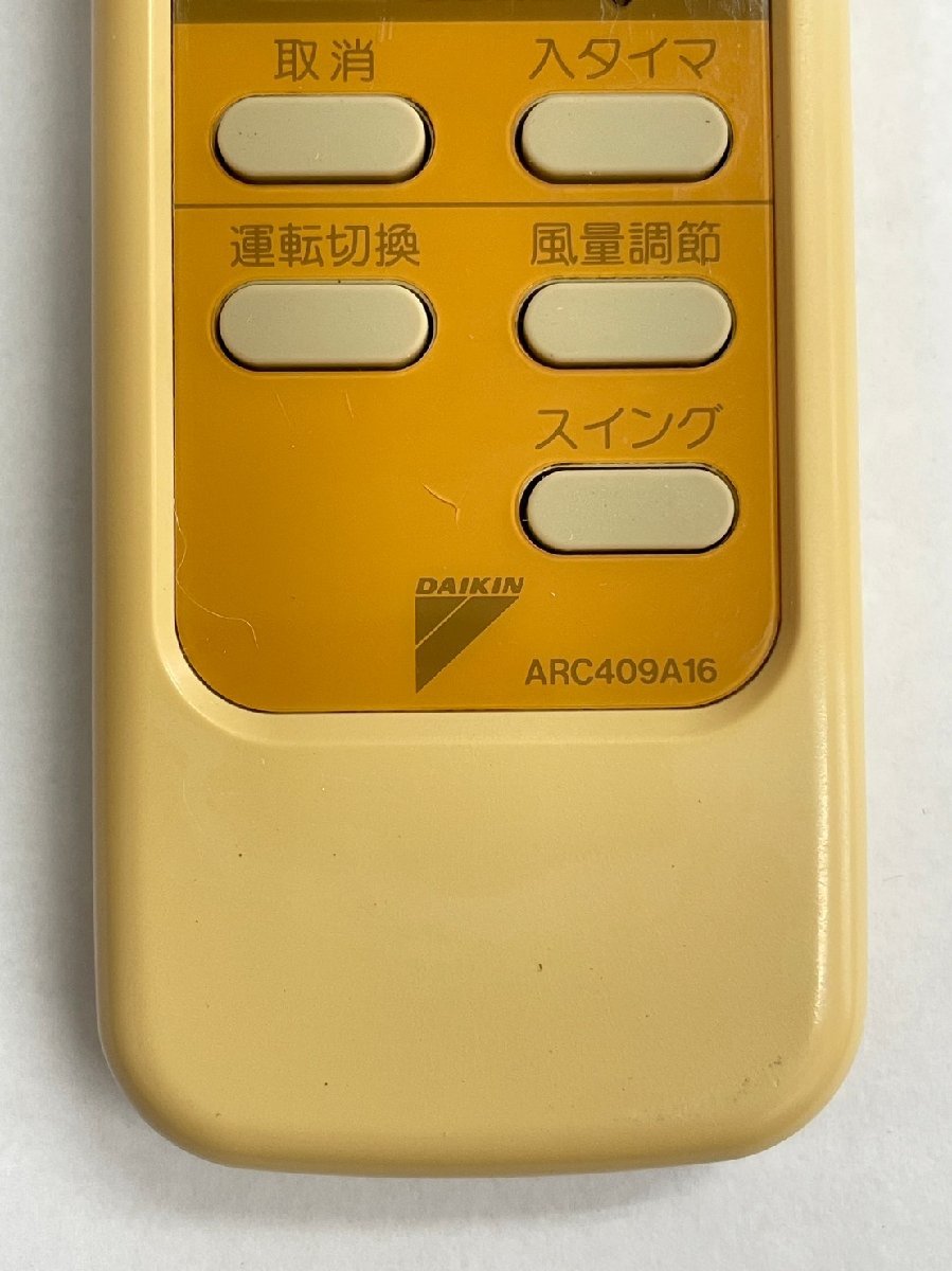 【DAIKIN ダイキン ARC409A16】【動作確認済/赤外線チェック済】中古リモコン単品での販売です。若干の日焼け跡がをございます。 リモコンホルダーを付属しておりますので壁に掛けてお使いいただけます。 電池を入れてお送りいたしますので、お受け取りいただけましたら通電防止の紙を引き抜いてからご使用ください。 可能な限りクリーニングしておりますが、傷、色あせ、経年劣化はあるものとお考えください。 見た目に関して神経質な方のご購入はお控えください。 電池のお届けは画像と異なる場合がございます。 対応機種のご質問の返答はできかねますので、各メーカーへお問い合わせいただくか、インターネットで取扱説明のご確認をお願いいたします。 対応機種の誤り、設定、エアコン本体のトラブルは保証対象外ですので予めご了承ください。梱包材はリサイクル資材を使用する場合がございます。予めご了承ください。 中古リモコンは現品限りとなりますので、ご希望の商品がございましたらお早めにご購入ください。 ※他店でもこちらと同じ中古リモコンを販売しております。そのため他店でお客様より先に購入があった際は、大変申し訳ございませんがご購入いただいた商品はキャンセルとさせていただきます。あらかじめご承知ください。