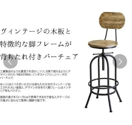 下記よくお読みの上お願いします。在庫変動しますので、ご注文前に在庫のお問い合わせをお願いします。送料無料離島沖縄北海道は別途お見積りです。廃盤の場合を除き理由の如何にかかわらずキャンセルはできません。武骨でヴィンテージ感のあるインダストリアルシリーズ、バーチェア。天然木の座面・背板には、一つ一つ表情の違う加工が施され、1点物のような雰囲気を醸し出します。高さ調節は回転式、レバーで固定できます。脚部はアジャスター付。備考:組立式(組立時間約20分)製品サイズ:約幅49×奥行49×高さ103~110cm(座面高約70~77cm)下記よくお読みのうえお願いします。 他サイトでも販売しておりますので、タイミングによっては完売となっている場合がございます。 入札前に在庫の確認を質問欄からお願します。 ご質問ないまま落札され、決済をされた後、在庫がなくお届けできない場合は決済手数料を引いてのご返金となります旨あらかじめご了承くださいませ。