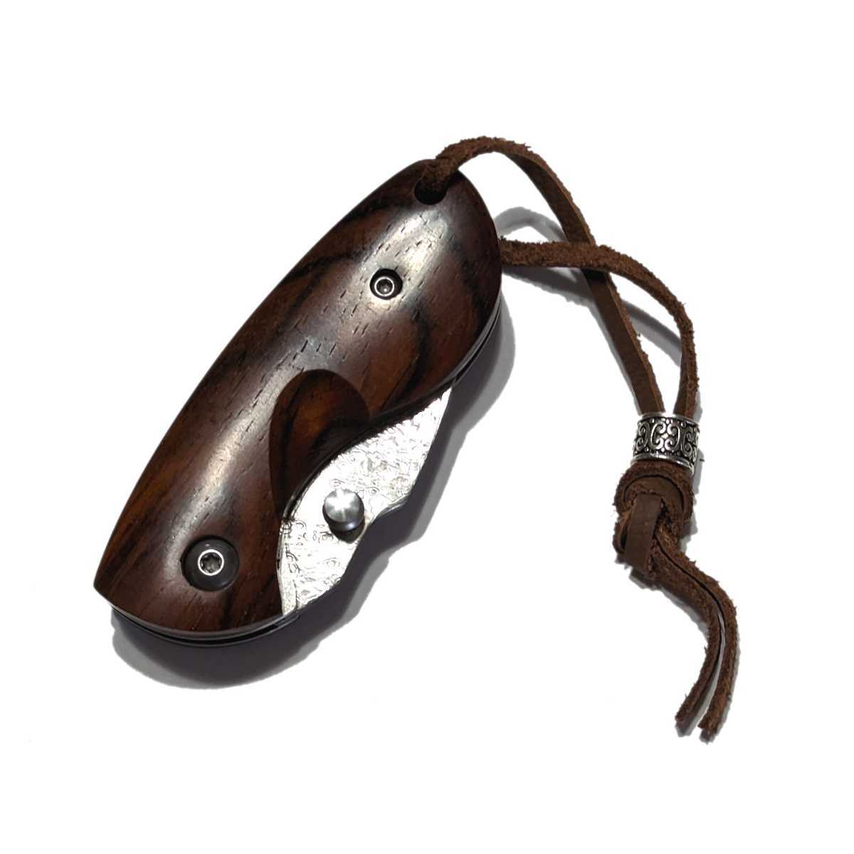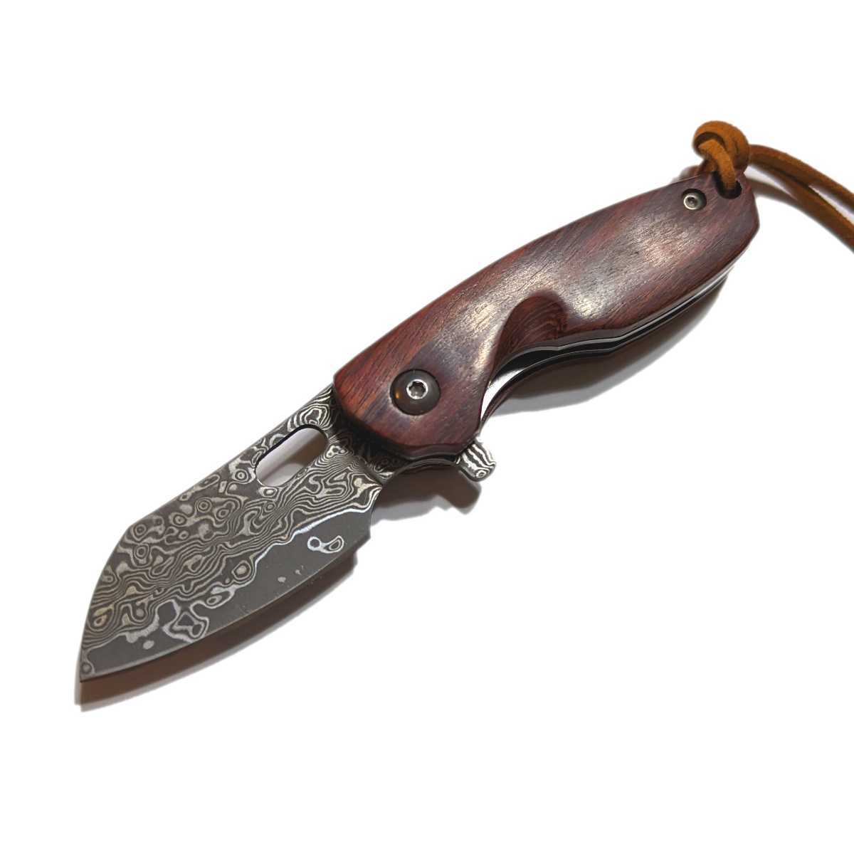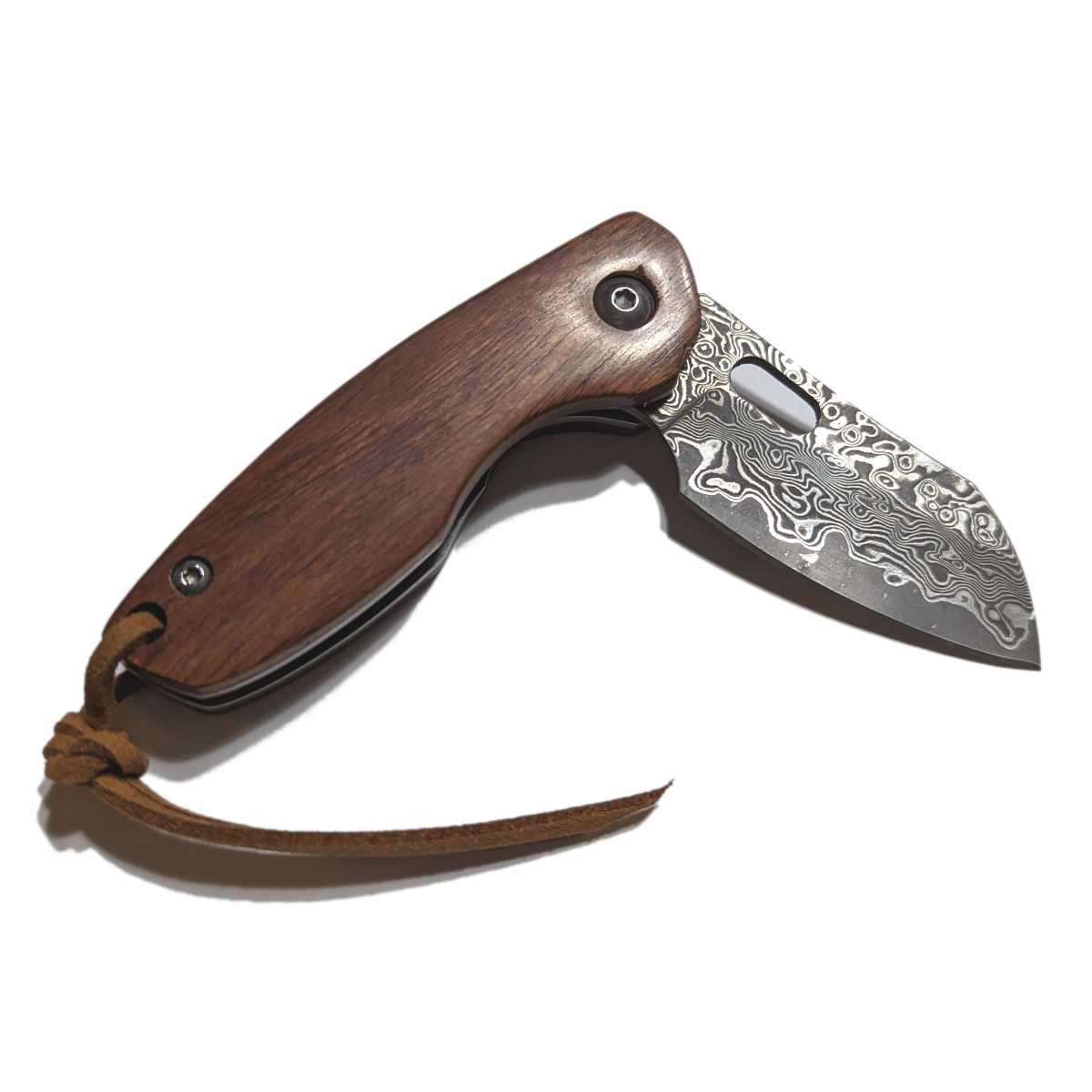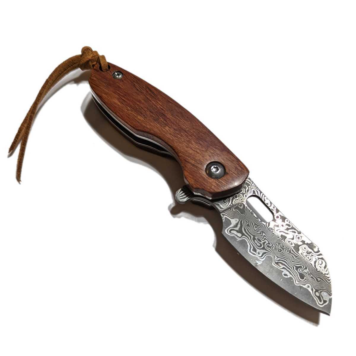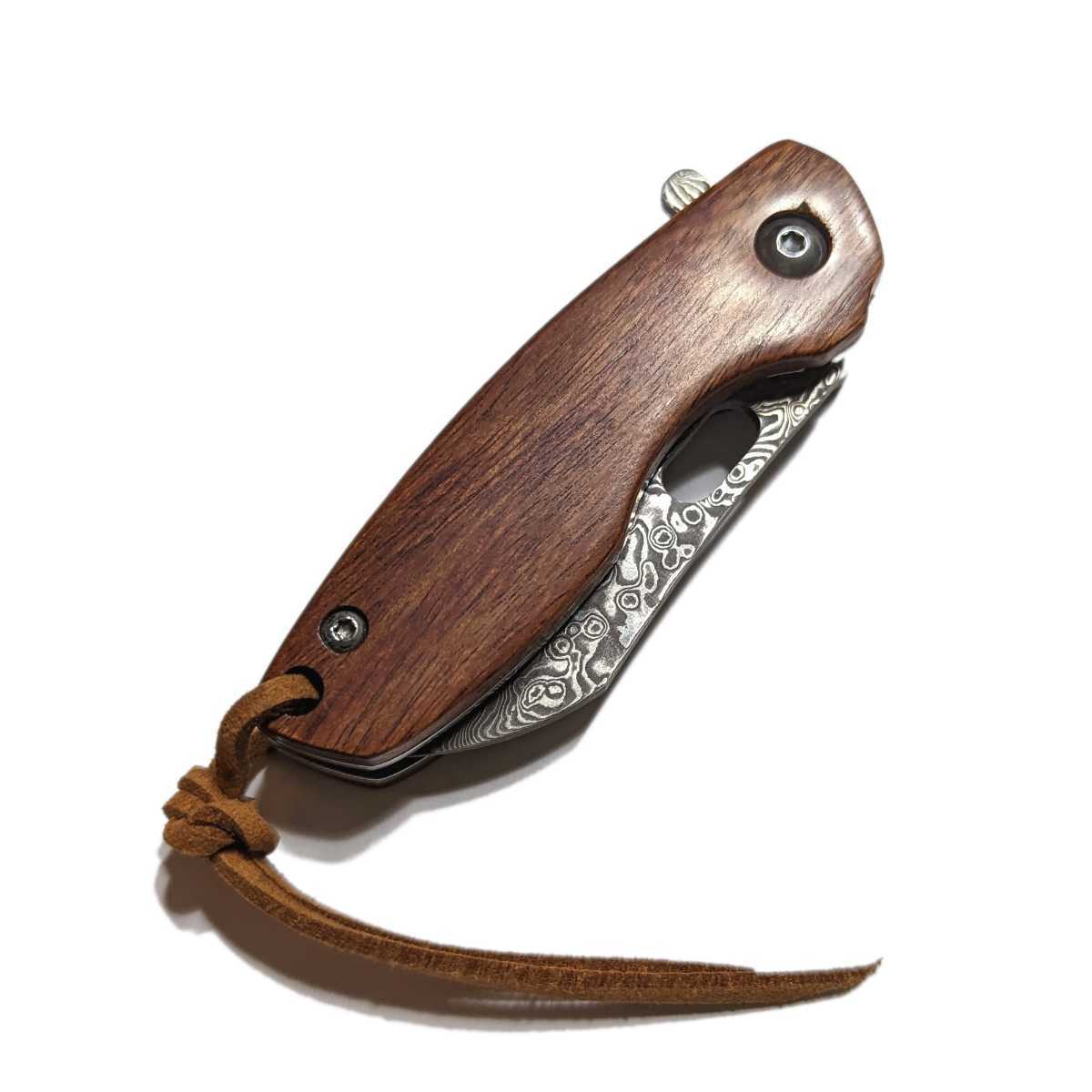 刃には美しい模様のダマスカス鋼、 ハンドルは天然木を使用した折り畳みナイフです。 折りたたむと軽量・小型で使い勝手が良いです。ベアリング機構により開閉がスムーズに行なえます(バネなどの自動開閉機構はありません)。