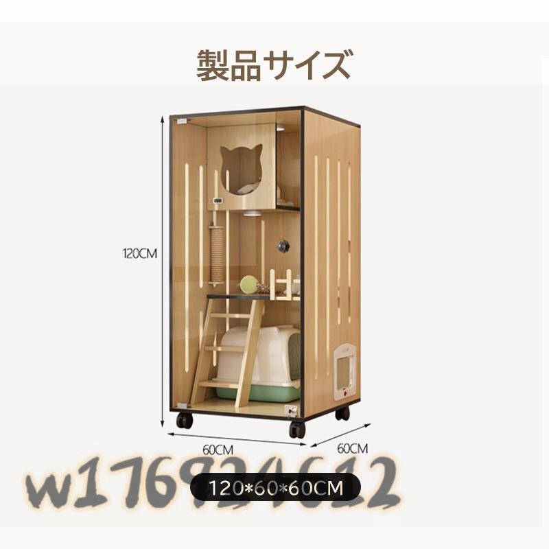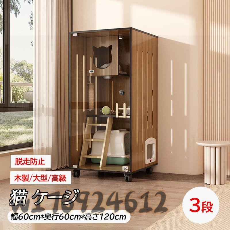 国内稀少!キャットケージ 大型 おしゃれ 透明ガラスドア キャスター 猫ゲージ 保護 脱走防止 60*60*120cm 3段 木製 留守番 室内飼い