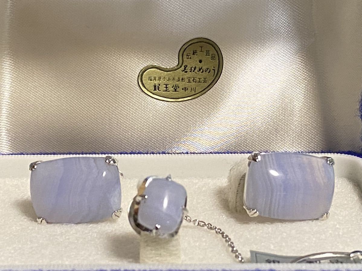 薄紫の縞瑪瑙がさわやかなタイピンとカフスのセットです。大きさはカフスが縦約19ミリ幅約14ミリ。自宅での保管品で未使用です。しおり、専用ケース付き。