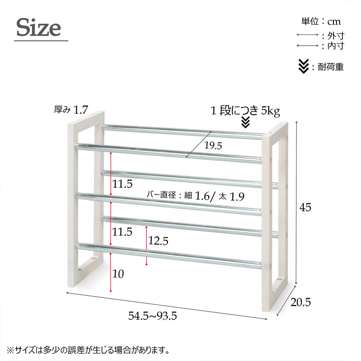 商品説明 | 伸縮式シューズラック3段 WH 落札後、最初の連絡で配達伝票に記載する電話番号をお尋ねします スペースや収納量に合わせて伸縮自在なシューズラック 玄関に圧迫感を与えないスリムデザインなのに靴をスッキリ収納◎ オープンタイプなのでニオイや湿気がこもらず快適にお使いいただけます。 2個を上下で連結させれば収納量を倍にすることも可能。 どこにでも置ける省スペースなサイズ感は玄関の他にもウォークインクローゼット内の収納にもオススメです。 シャビーで明るい雰囲気のホワイトと落ち着きあるモダンな空間を演出するブラックの選べる2カラー。 ・幅調節可能 ・スタッキング可能 サイズ・容量 ■商品サイズ 幅545~935×奥行205×高さ450mm ■商品重量 約2.0kg 規格 素材:天然木(パイン材)・スチール 塗装: 側板/ラッカー塗装 伸縮パイプ/クロームメッキ塗装 ※フレーム上下に連結用の穴があり、2点まで積み上げて連結可能です。 ベトナム製 組立品 ホワイト(WH)専用ページです、ブラック(BK)も有りますが別ベージとなってます。 (1枚目の写真は取扱いカラー全色を載せていますが、専用ページカラー以外の画像は参考として下さい) カタログ価格7600円 |