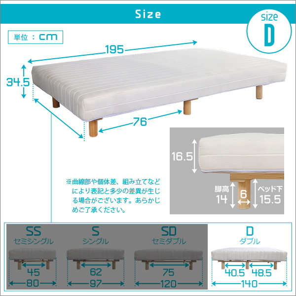 商品説明 | 商品名:脚付きロールマットレス ユニテ・ライド ホワイト色 ダブルサイズ 商品サイズ:(約)幅140x奥行195x高さ34.5cm 商品重量:35.7kg 梱包サイズ 2個口 (2-1) (約)幅144×奥行28×高さ28cm (2-2) (約)幅123×奥行20×高さ24cm 梱包重量:38.4kg 素材 張り材:ポリエステル100% クッション材:ボンネルコイル、ウレタン、フェルト、不織布 本体:LVL、パイン(脚) 耐荷重180kg お客様組立商品 商品画像は、デジタルカメラで撮影しておりますので、 お客様のPCモニターやインターネット環境の違いにより、 多少色合いが違って見えることが御座います。 予めご了承下さい。 |