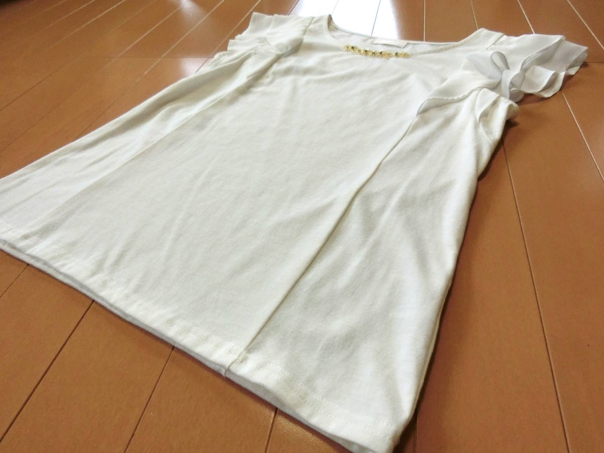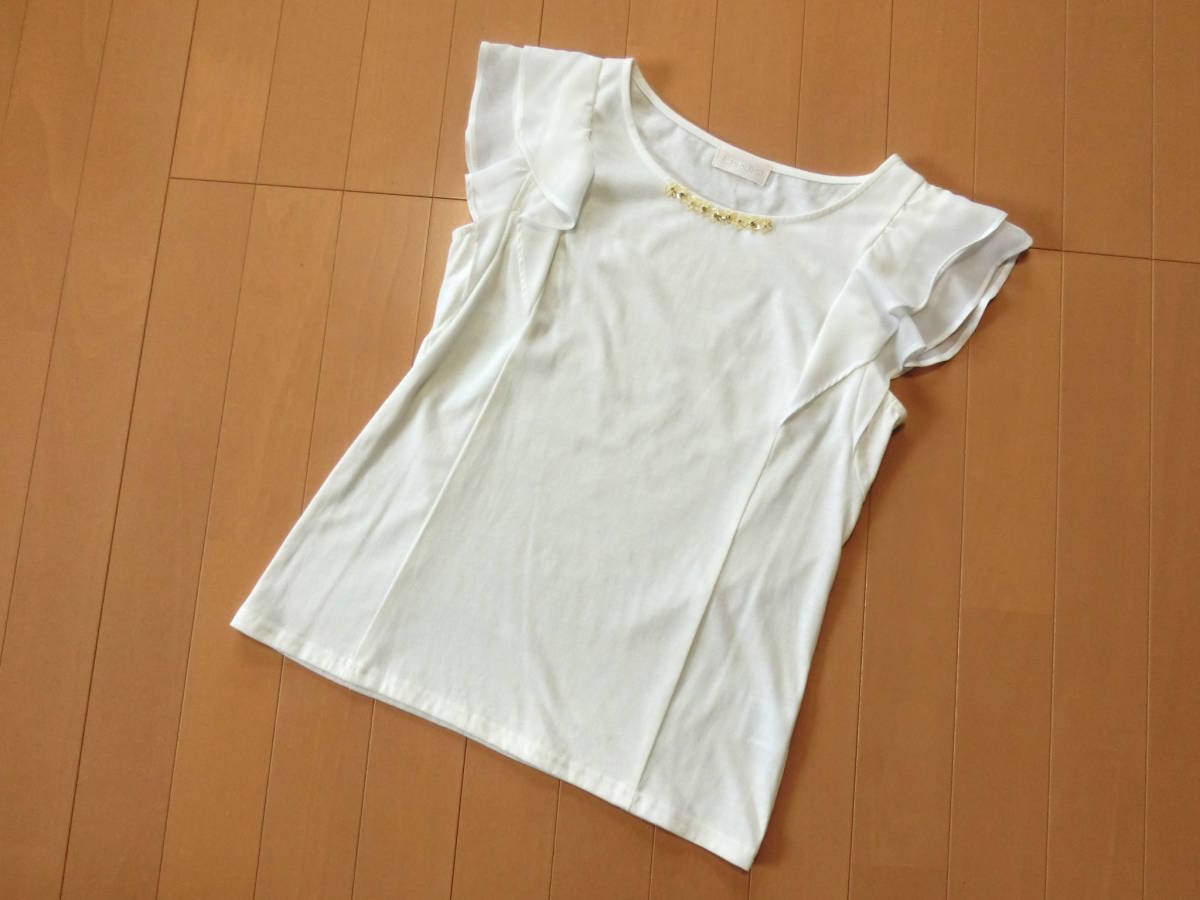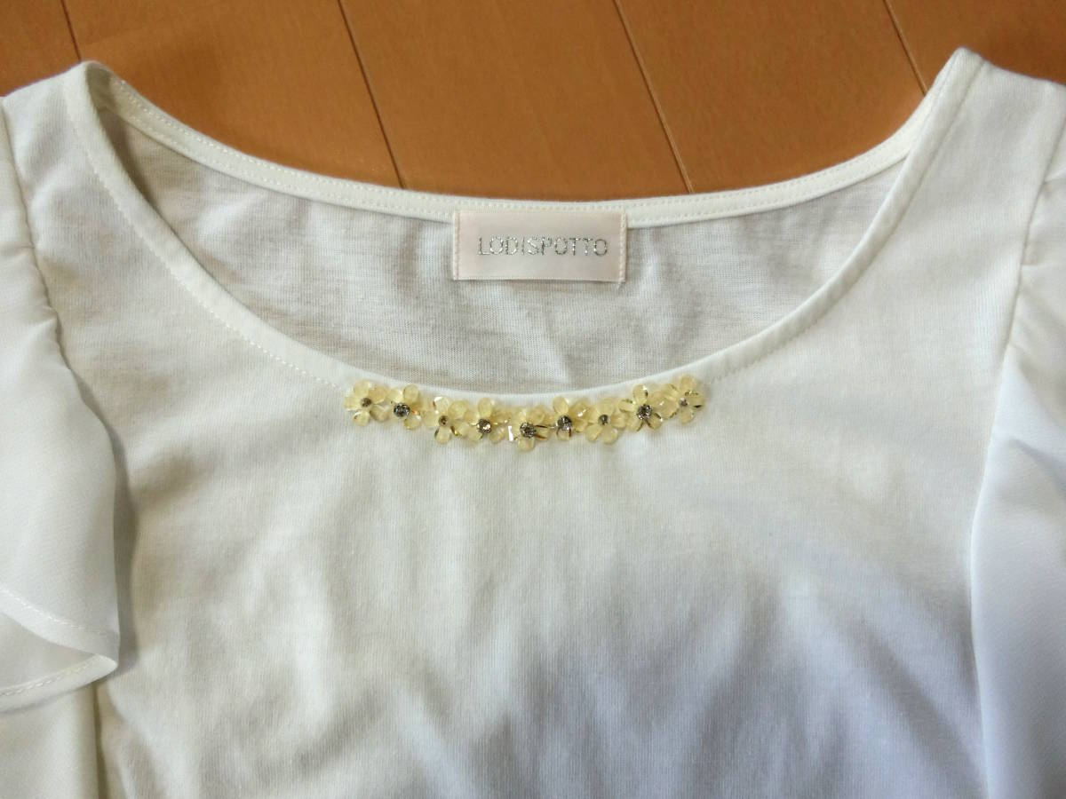ご覧いただきありがとうございます! ロディスポットのシフォンフリル袖カットソーです。 シフォンのフリルを2枚重ねた袖が愛らしいカットソー。 ビジューもあしらわれ、カットソーなのにきれいめの印象に仕上げてくれるのがポイント。 ブラウス感覚で着られるカットトップスです♪ カラー オフホワイト サイズ M 素 材 ポリエステル65% 綿35% 別布:ポリエステル100% 平置き実寸 着丈約56cm 脇下幅約41cm 裾幅約44cm USEDです。 シミ汚れはありません。 | |