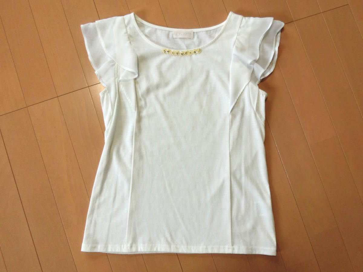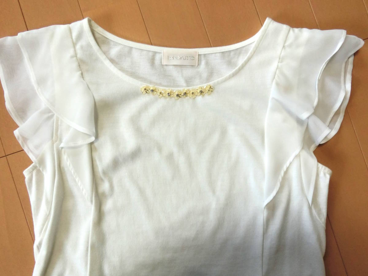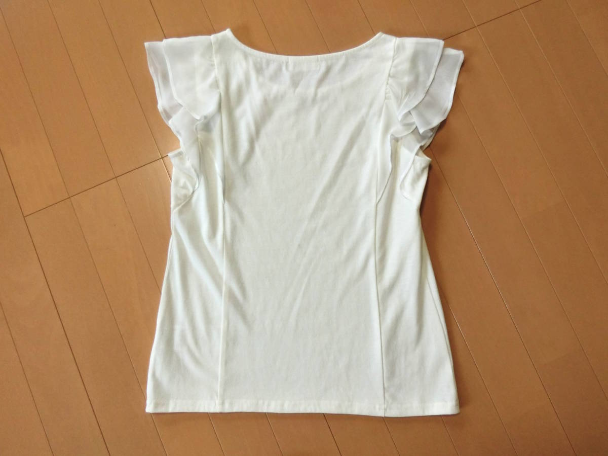ご覧いただきありがとうございます! ロディスポットのシフォンフリル袖カットソーです。 シフォンのフリルを2枚重ねた袖が愛らしいカットソー。 ビジューもあしらわれ、カットソーなのにきれいめの印象に仕上げてくれるのがポイント。 ブラウス感覚で着られるカットトップスです♪ カラー オフホワイト サイズ M 素 材 ポリエステル65% 綿35% 別布:ポリエステル100% 平置き実寸 着丈約56cm 脇下幅約41cm 裾幅約44cm USEDです。 シミ汚れはありません。 | |