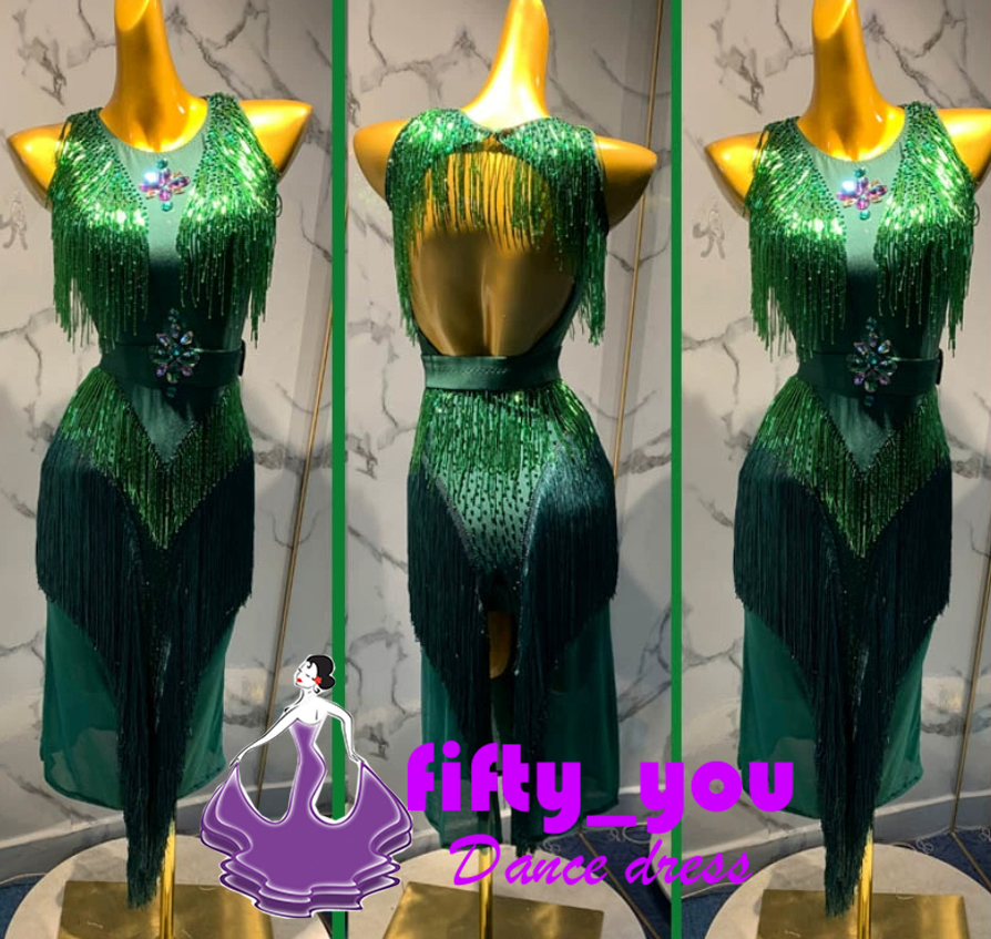 新品fifty_you 競技豪華ドレス レディース社交ダンス衣装 サイズセミオーダー ラテンダンスドレス ゴージャスビーズ飾 グリーン