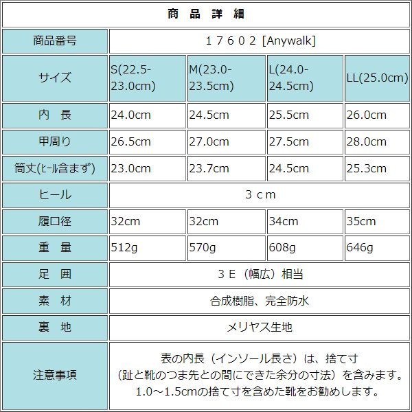 履き口:約32cm、全高:約26.7cm、ヒールの高さ:約3cm、重さ(片足):約570g