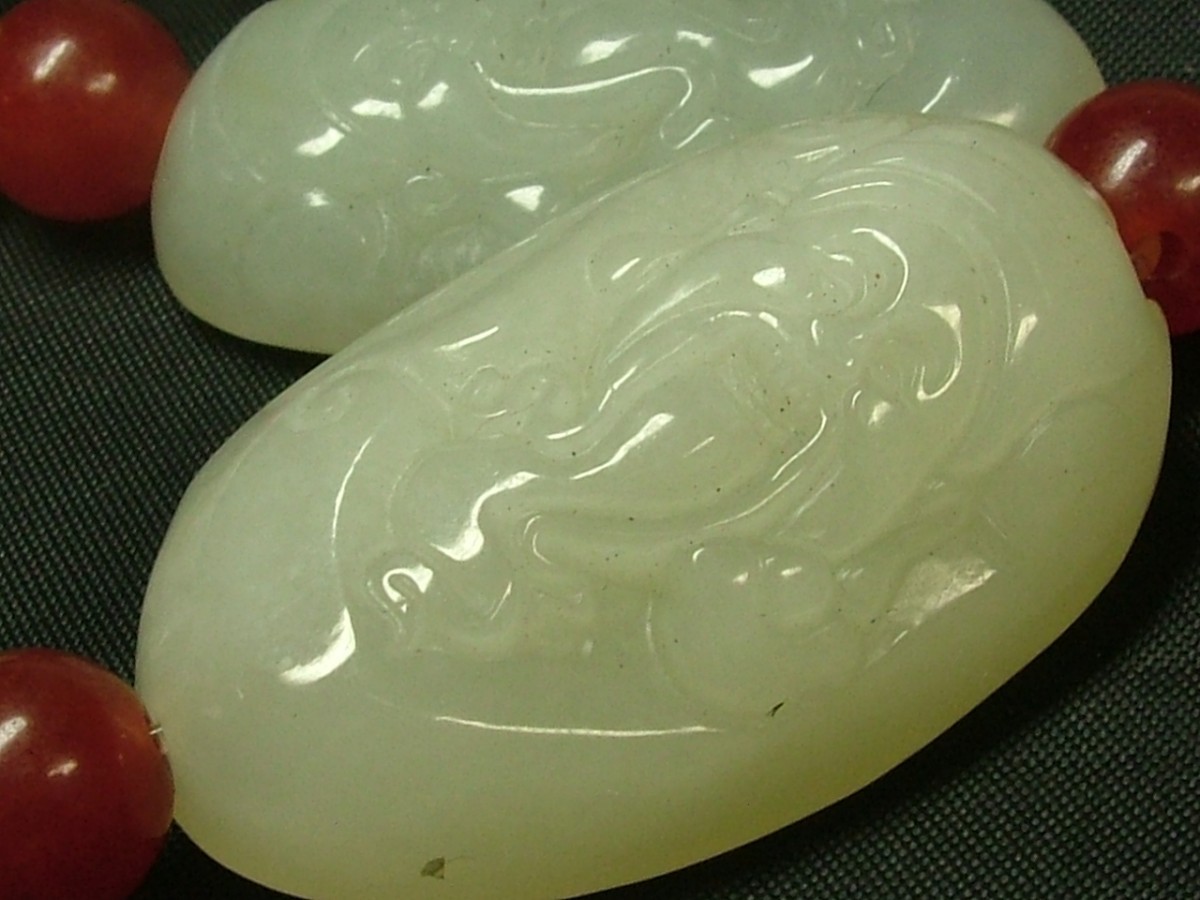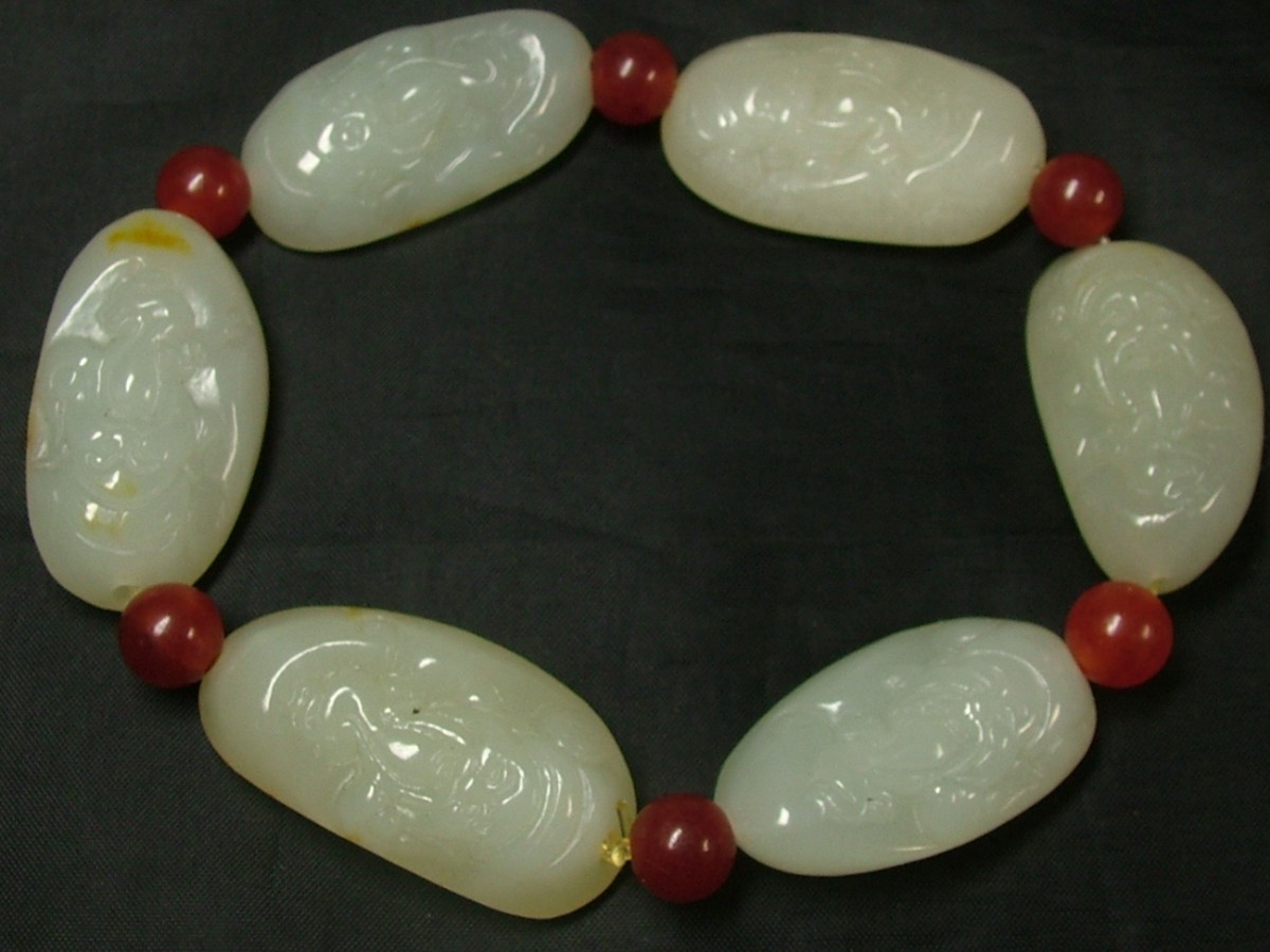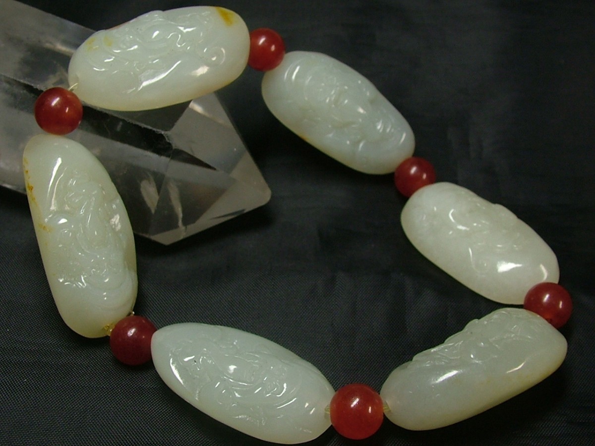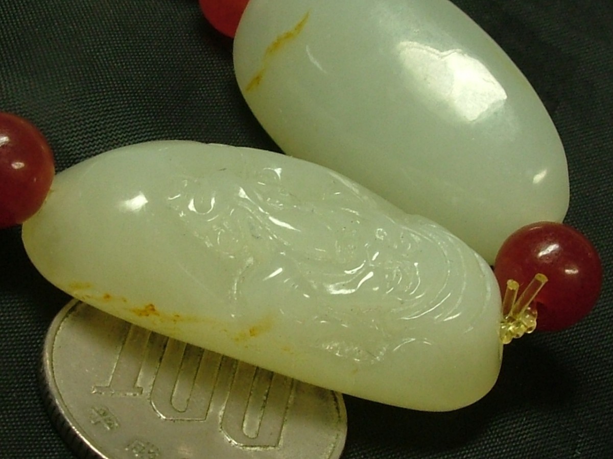 ★商品説明★ | 環周(内):約200mm 石1Pサイズ(約):32×18×13mm 重さ:69.5g 今は中国でも貴重な石、和田白玉(ホータンはくぎょく)。それぞれ片面に飾り彫りを入れられた表情豊かなブレスです。赤い丸石は瑪瑙です。中はシリコンゴムが通っています。 ☆環周サイズに御注意下さい。 ●中国の西部砂漠地域(新彊、甘粛)の河床(今は水が無い所)から出る玉(ぎょく)は、中国では和田(ホータン)白玉と呼ばれ、何千年も前から珍重されています。翡翠の照りとは違い、ねっとりとした潤いがあります。中国の玉(ぎょく)コレクター垂涎の石です。 |