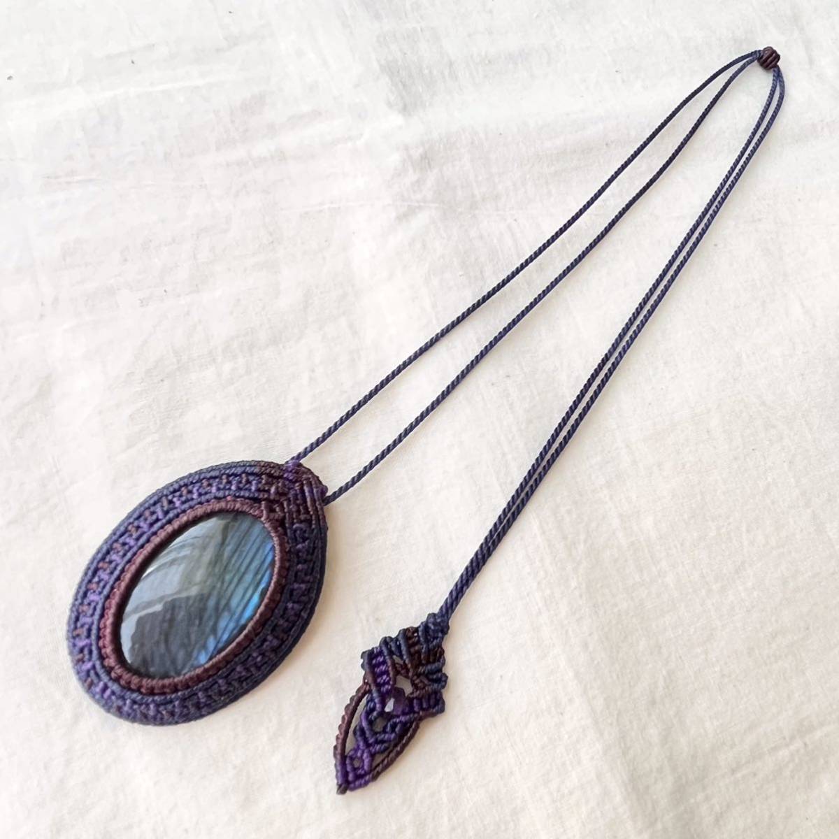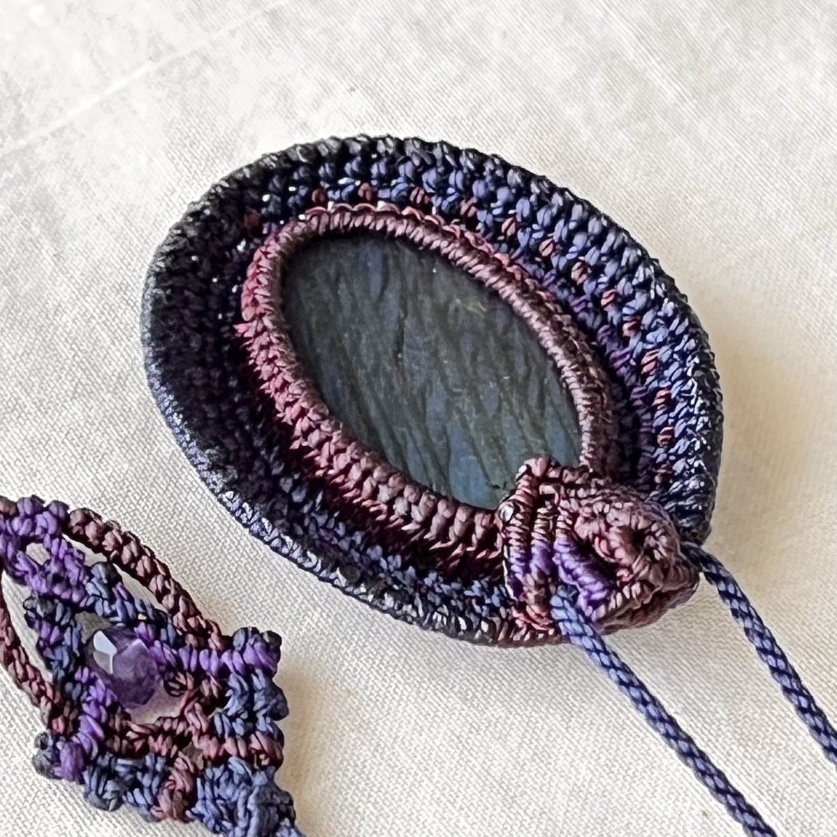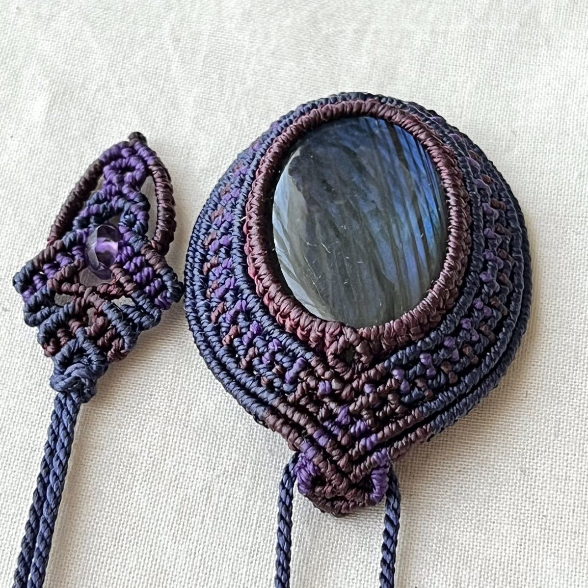 マクラメは糸を固く結びながら装飾を施す技法です。糸端は焼き留めで仕上げております。その為ニットやオーガンジーなどのザックリした生地に引っかかる場合があります。