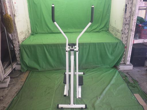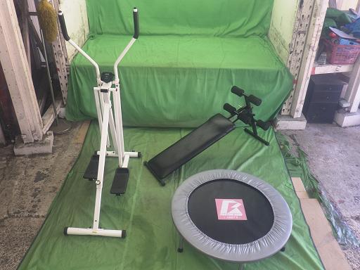 店頭引き取り前提にてお考えください。腹筋ベンチ、トランポリン、エアウォーカーのセット。全て使用感あり。破れ・穴等はなし。ベンチはメーカー表記なし、トランポリンはファイティングロード製直径91センチ。エアウォーカーは中央にある機械部分は、電池切れの為動作確認できず
