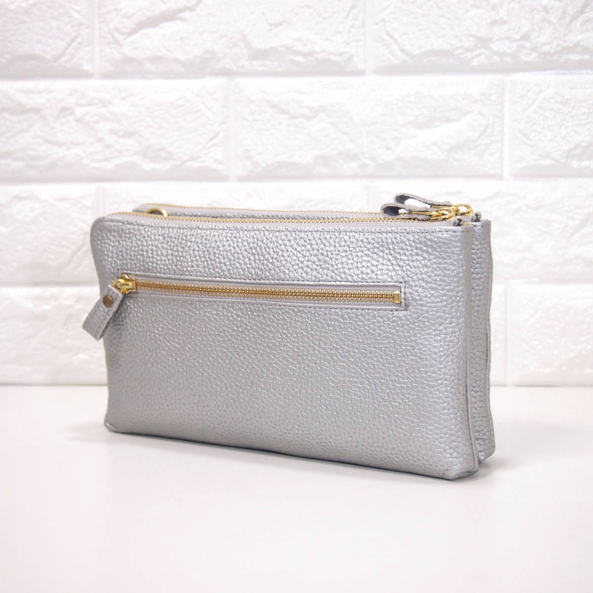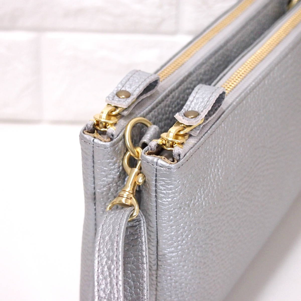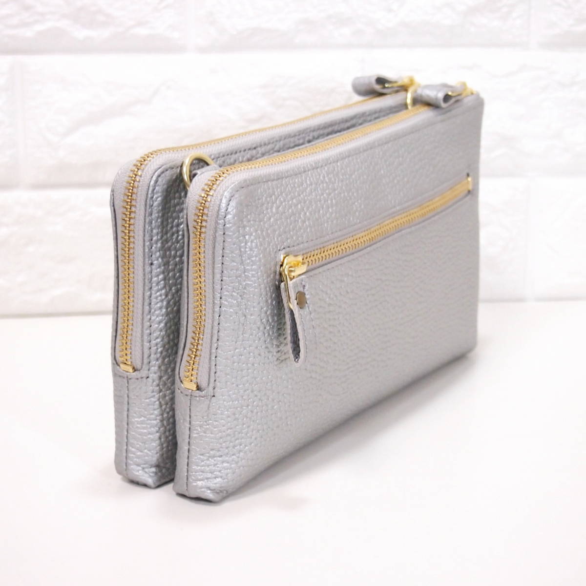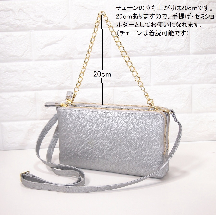 ★新品★ハンドメイド★日本製★本革★お財布ポシェット★ダブルファスナー★斜め掛けショルダーバッグ★シルバー色★ゴールドチェーン★