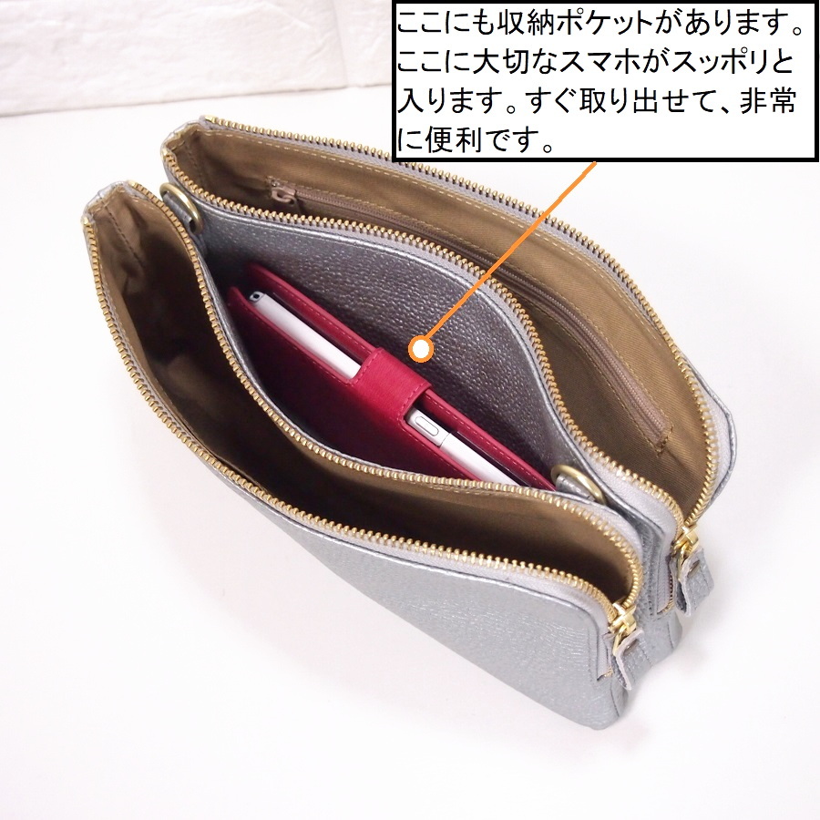 ●バッグとバッグの間に「スマホポケット」を付けました。(ポケットの長さ17.5cm。ここも本革です)ここに大切なスマホが入ります。これ結構、最高に便利です!。ファスナーを開けずに、スッと取り出せ、サっと仕舞えます。スマホを取り出す際、バッグの中でのスマホの迷子からオサラバできますよ。