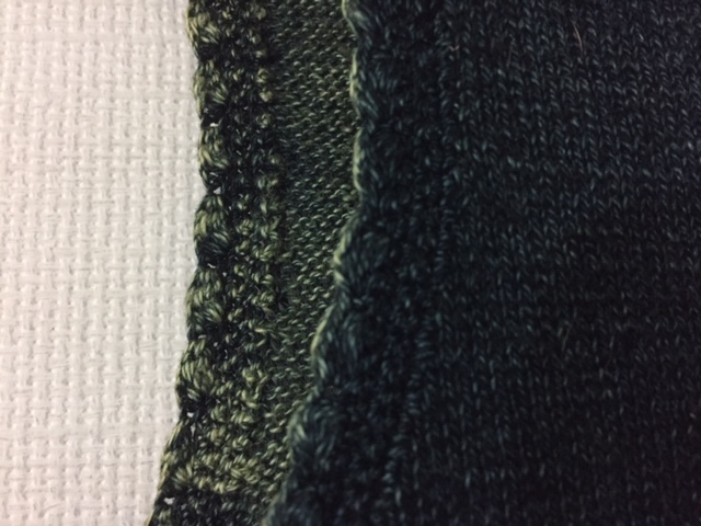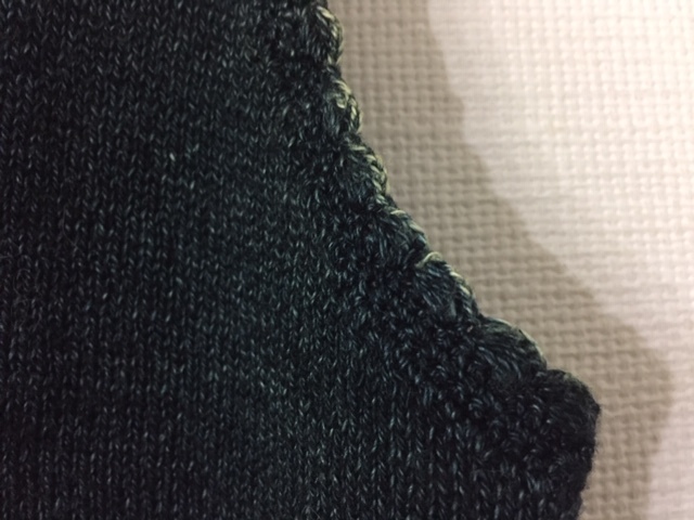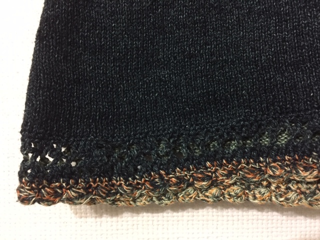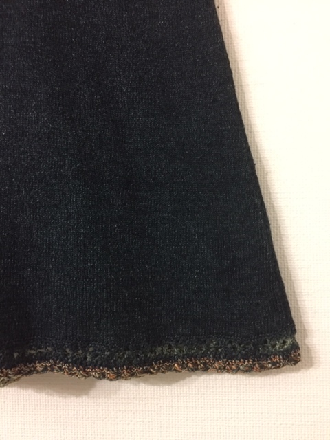 襟まわり、袖ぐり、裾まわりにかぎ針レースで裾まわりはミックスカラー糸使用。