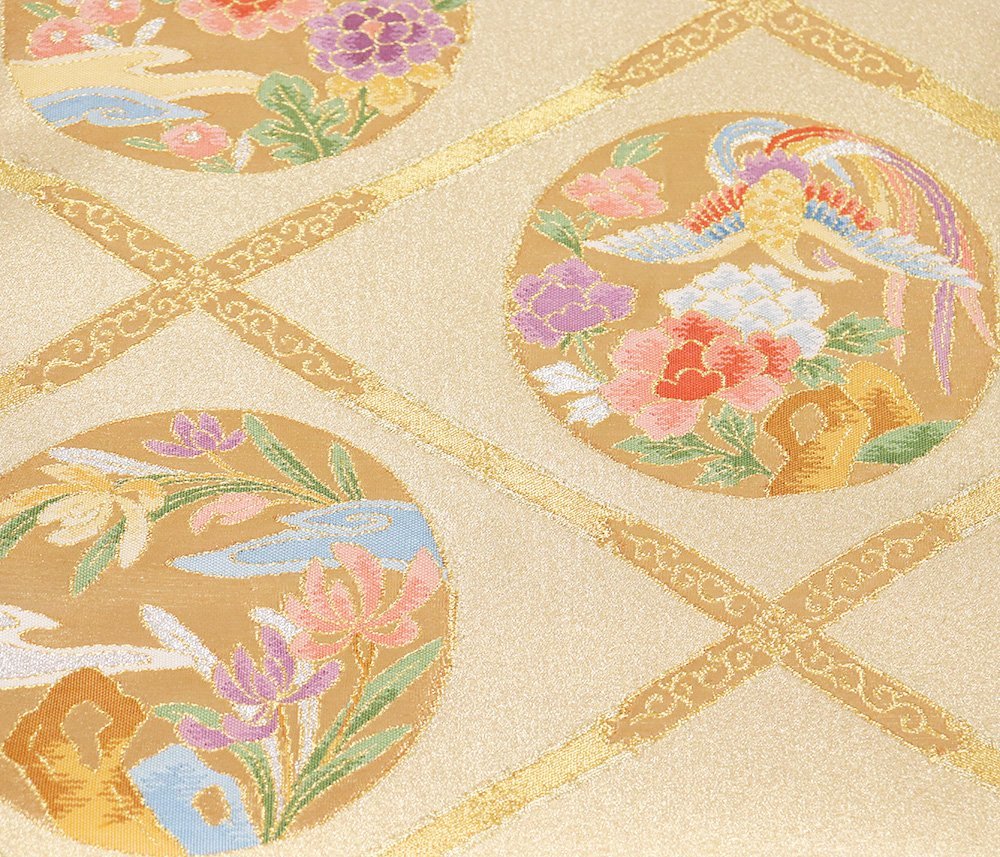 | 綴れ織袋帯 金地 梅・牡丹・菊・菖蒲 仕立て上がり | |