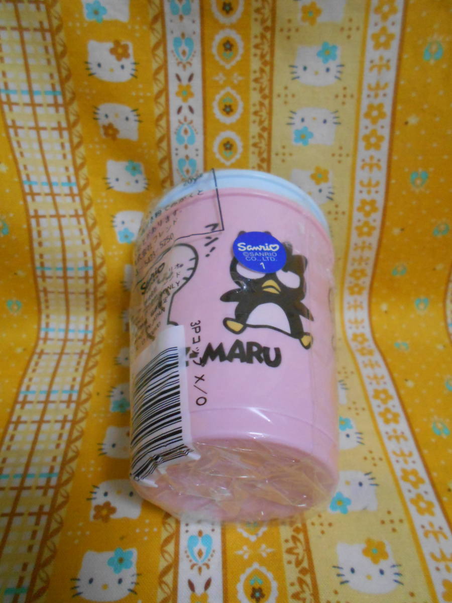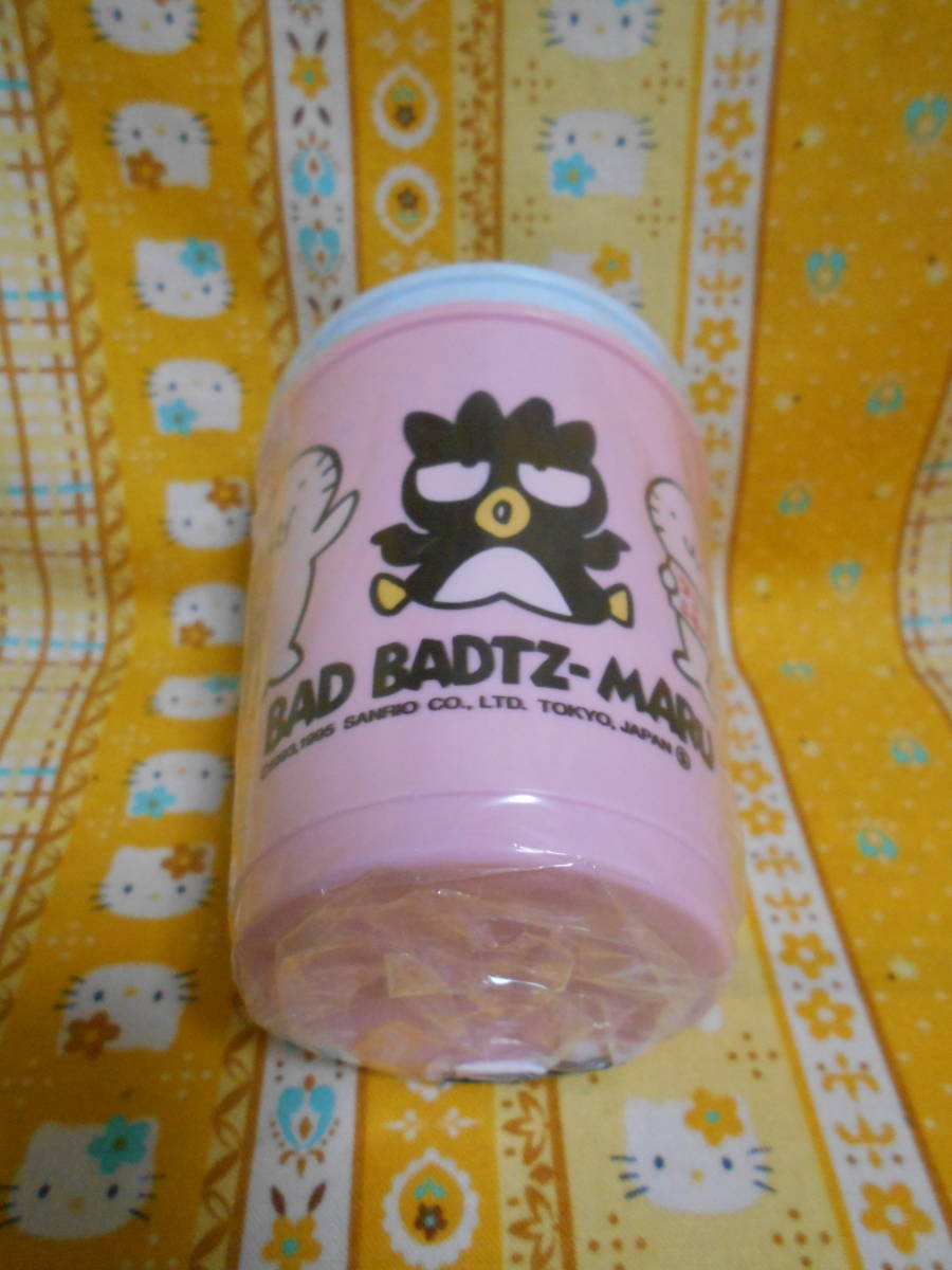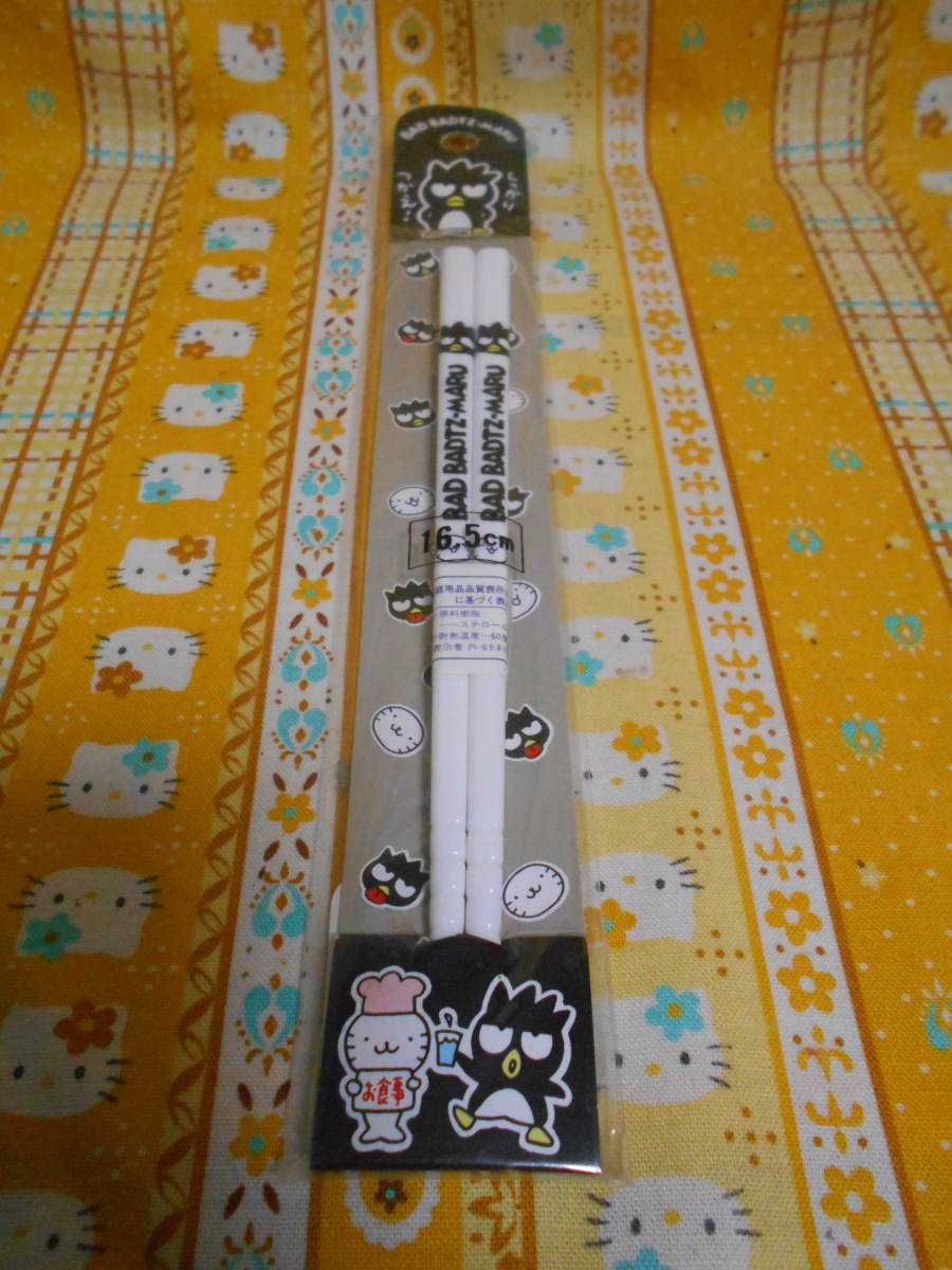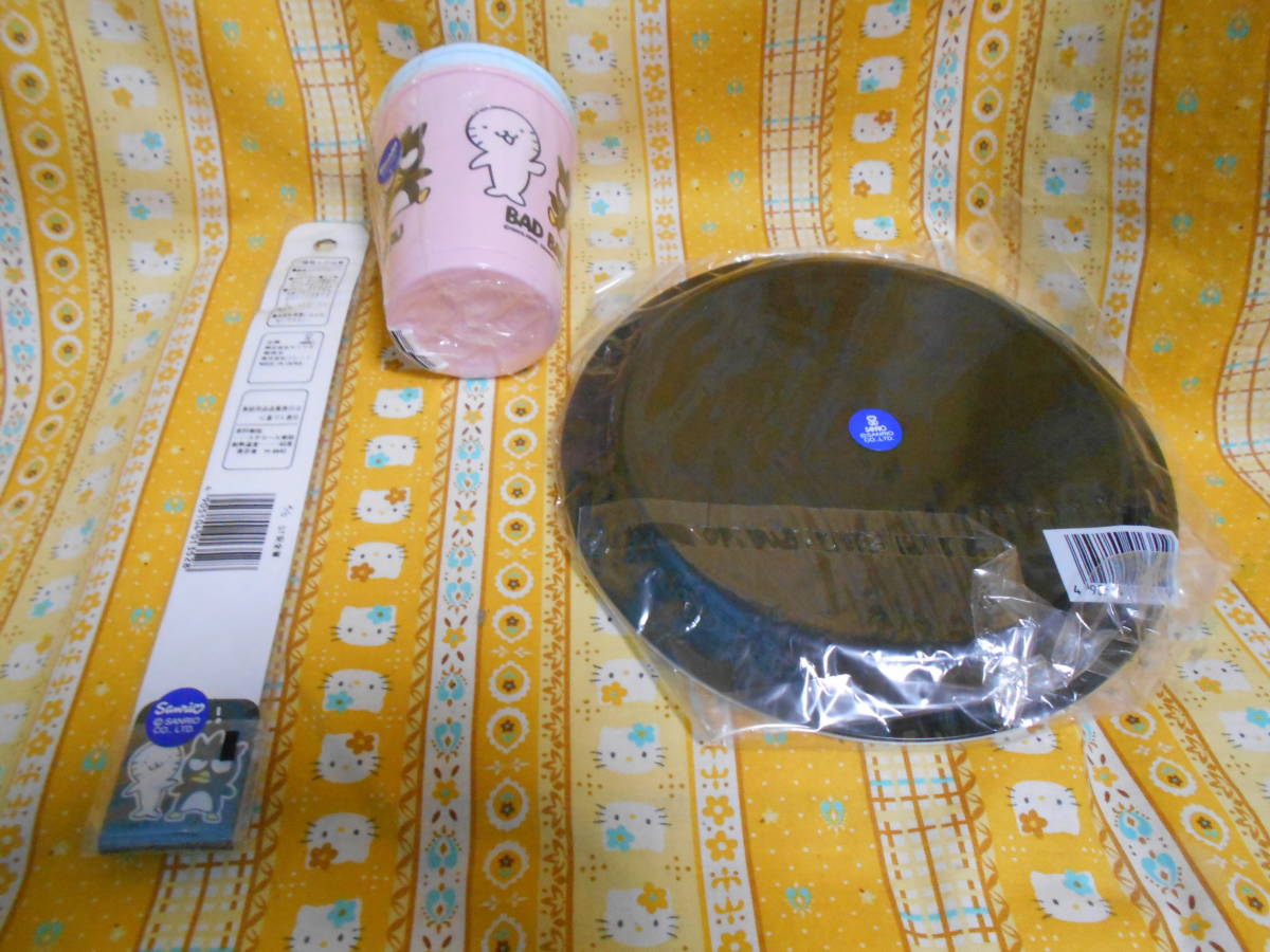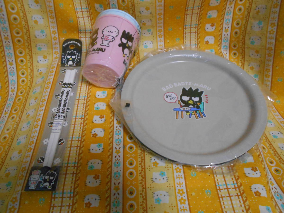♪バッドばつ丸新品サンリオプラスティック製箸1995&プラ製コップ2個ブルーピンク&プレート中皿ブラック&グレー2枚セット1996