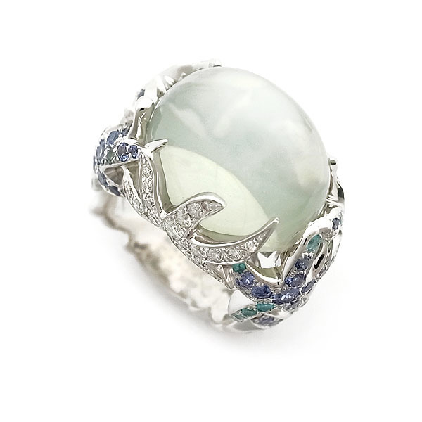 コメント 優れたデザイン性と確かな職人技術で、自然からインスピレーションを受けた森の動物や草花をモチーフとして作品を作り続けているMATHON(マットン)。とろけるような神秘的な色調のムーンストーン(横約15.9mmx縦約11.7mm)をダイヤモンド、パライバトルマリン、タンザナイトをセットした躍動感あるモチーフで飾られたラグジュアリーなマルチカラーストーンジュエリー。