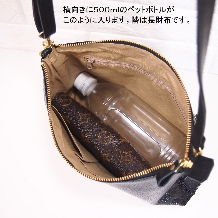 ●パンパンになった長財布、ケース付きのスマートフォン、母子手帳(おくすり手帳)類に加えて、ペットボトル(横置き)や小さめの化粧ポーチも入れて、コンパクトに持ち歩いていただけます。