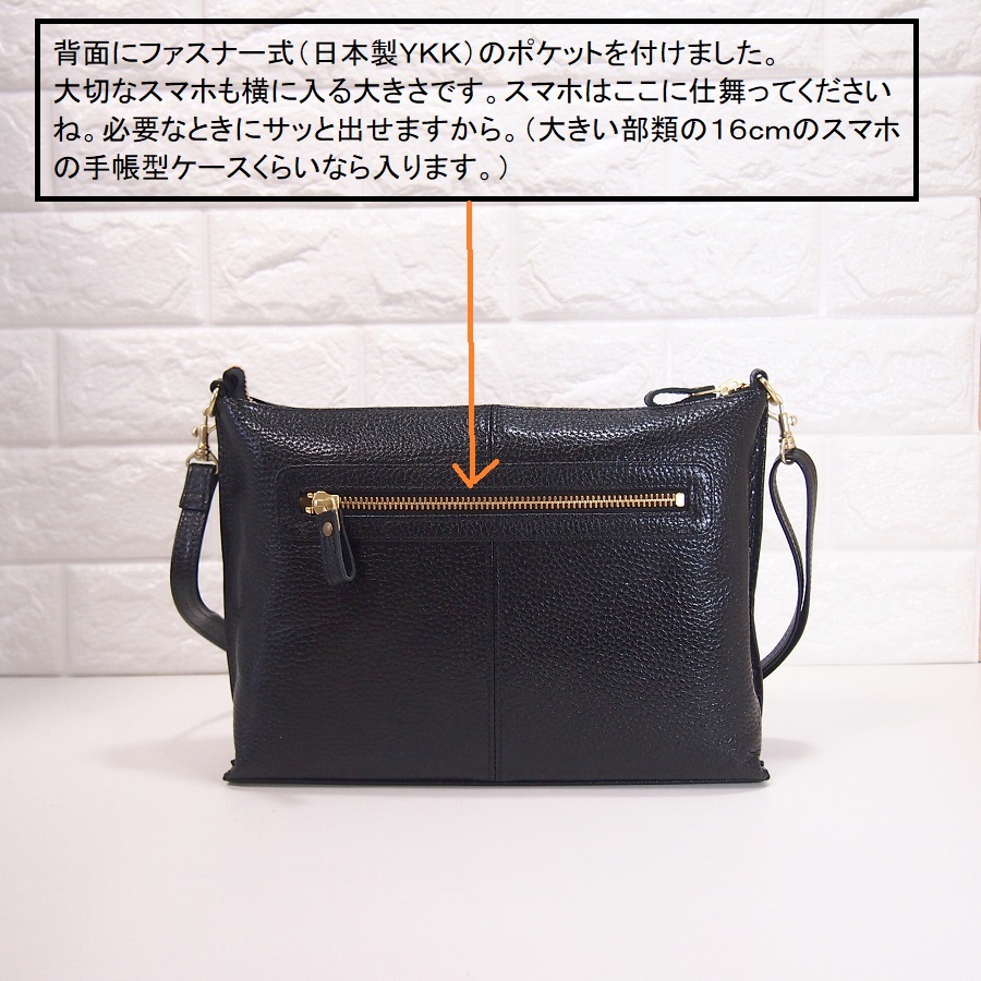 ●背面にファスナー式(日本製YKK)のポケットを付けました。大切なスマホも横に入る大きさです。スマホはここに仕舞ってくださいね。必要なときにサッと出せますから。(大きい部類の16cmのスマホの手帳型ケースくらいなら入ります。)