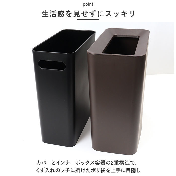 | 商品説明 | ・・インテリア空間に調和するモダンデザイン。袋を見せないくず入れ「ルクレール CV スリムダストボックス(9.5L)」が新登場。 ・【生活感を見せずにスッキリ】 ・カバーとインナーボックス容器の2重構造で、くず入れのフチに掛けたポリ袋を上手に目隠し。生活感を感じさせずにキレイな空間を演出。 ・【無駄のないシンプルデザイン】 ・内側に窪んだフチが、ゴミのこぼれ落ちをガード。中のゴミを見えにくくして、お部屋の雰囲気乱さない♪ ・【スリム&省スペース】 ・ベッドサイドやデスク下スペースなど、ちょっとした隙間空間に置きやすいスリムな長方形デザイン。 ・【お手入れもゴミ捨てもラクラク】 ・インナーボックスにポリ袋をセットし、カバーを被せたら完成!インナーボックスには取っ手があるので、ゴミ捨てや毎日のお掃除もスムーズ。 ・【お部屋に馴染むカラー】 ・フローリングの床やモノトーンのインテリアにすっきり馴染むベーシックカラー。リビングにはもちろん、キッチンやサニタリールームにも最適。 |