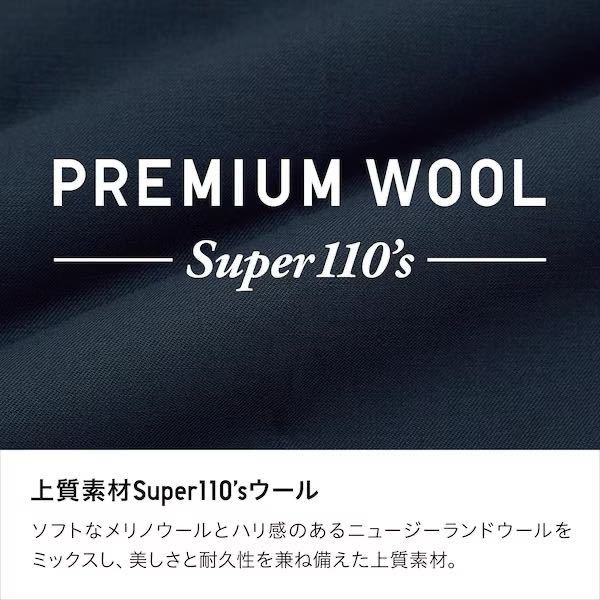 - ソフトな風合いのメリノウールと仕立て映えのするハリ感をもった高品質な羊毛原料であるSuper110Sを使用。