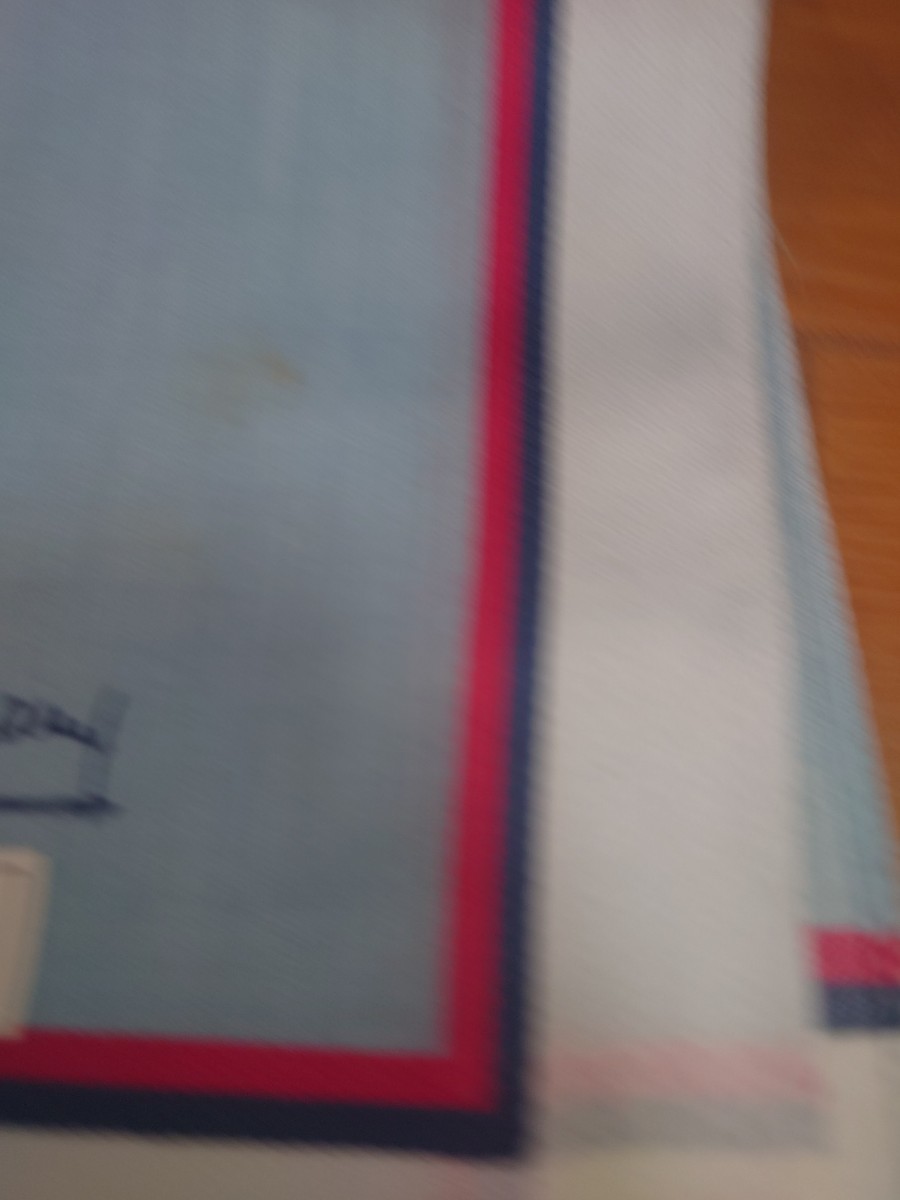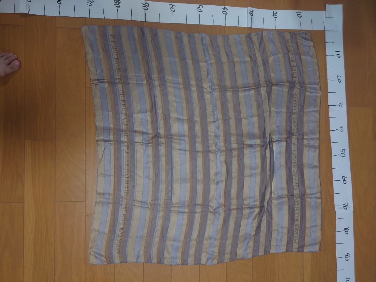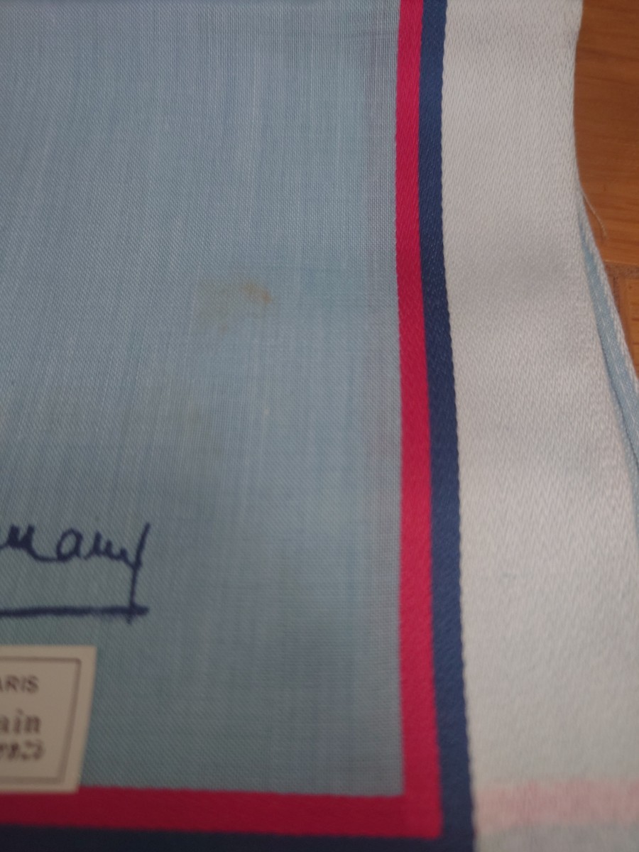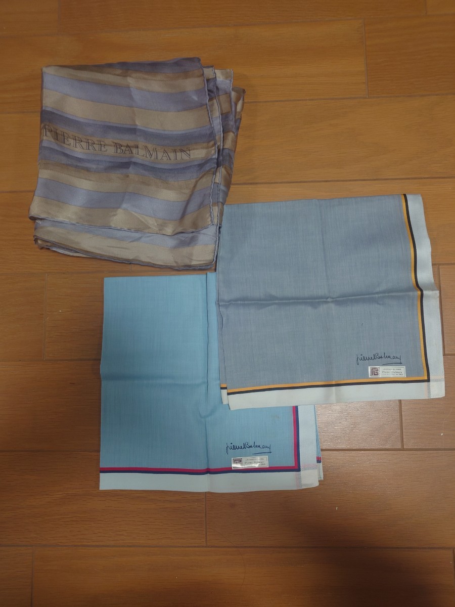 ハンカチは、未使用品ですが、青い方に汚れが付着しております。スカーフは未使用品ではありません。手触りはシルクっぽいですが、素材はわかりません。