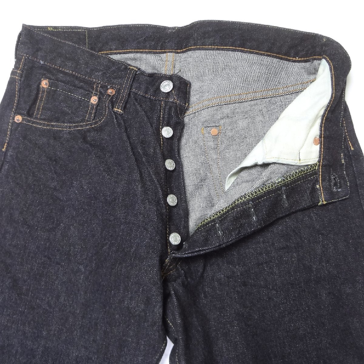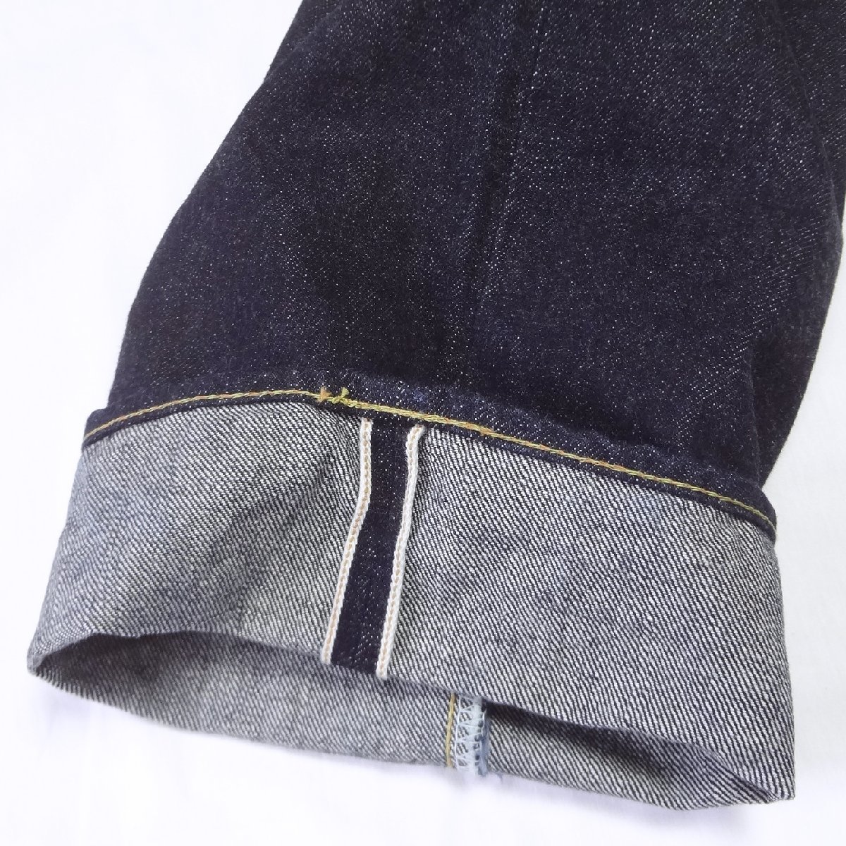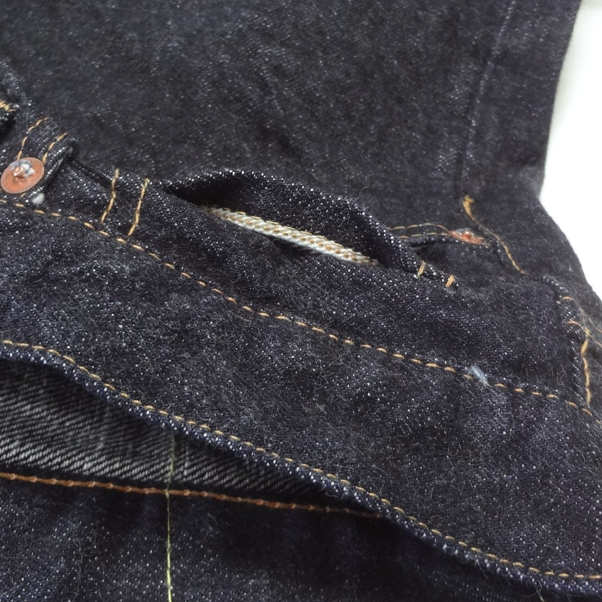 ・ボタンフライ、隠しリベット、赤耳、チェーンステッチ、レザーパッチ、5ポケットリベット、コインポケット裏赤耳