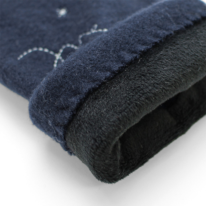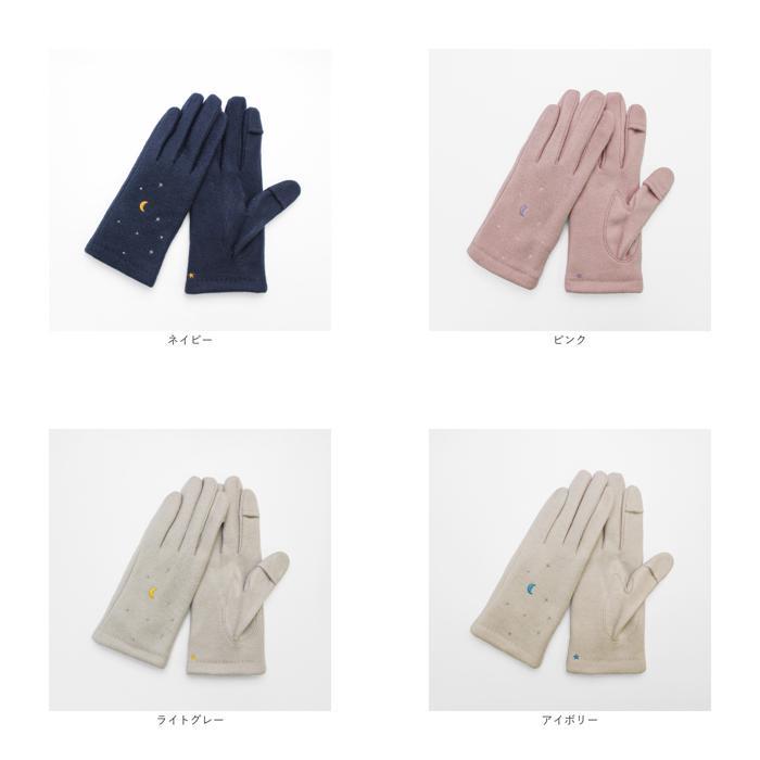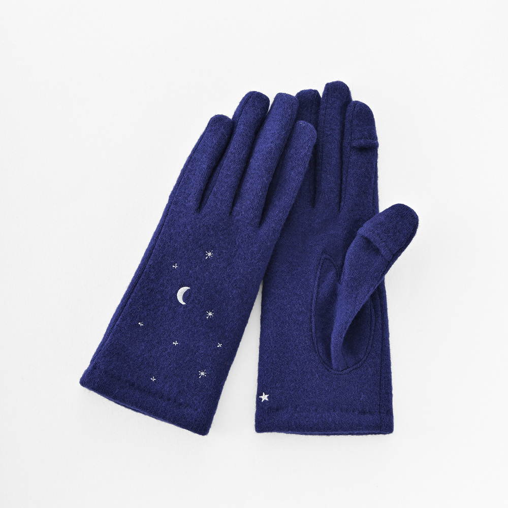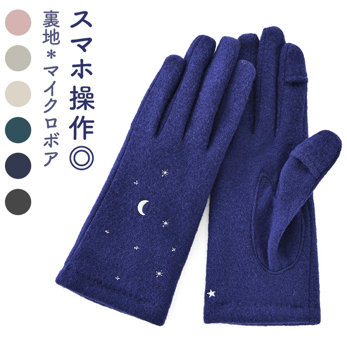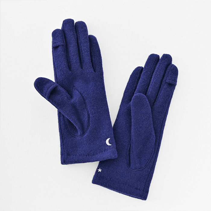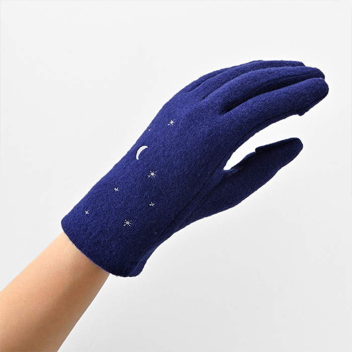 商品説明 | ・・三日月や流れ星、夜空を見ているような刺繍のジャージグローブ。 ・掌にも、こっそり刺繍を施してある。 ・裏地は、やわらかくあたたかなマイクロボアを使用。 ・「親指・人差し指」にはスリットが入っている為、指先を出し入れ可能。手袋を着用したままタッチパネル操作も楽々。 |