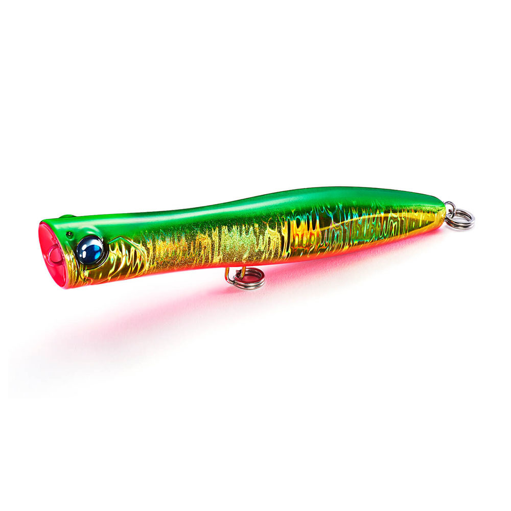 カップとボディのバランスで飛距離に差が出がちのスリムポッパー。ギリギリまで大きくしたカップ形状は、飛距離を落とすことなくポッピングでの強い水押しを残し、絞ったネック部分でキャスト時の空気抵抗を小さくしています。ボディ後半の断面を四角くすることでスリムなシルエットながら大きなウエイトを積む為の浮力とフラッシング効果をアップすることができました。スリムボディでありながら、飛距離面でもアピール面でも使いやすいポッパーに仕上がっており、ポッピングからエアーカーテンを伴うロングダイブが特に得意なルアーです。