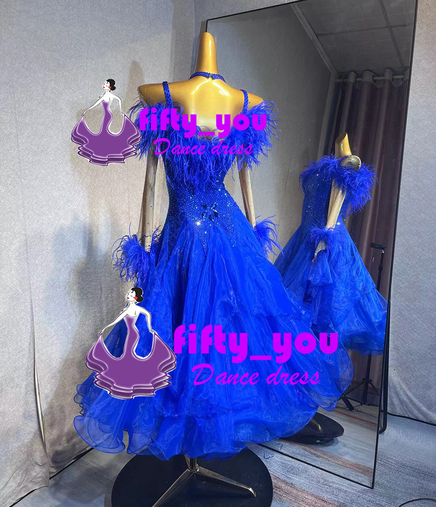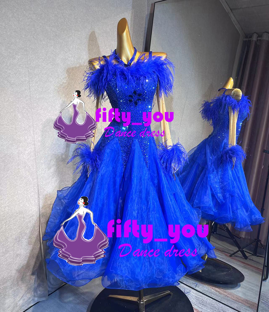 新品fifty_you セミオーダードレス  社交ダンス衣装 高級品モダンドレス スタンダードドレス ワルツドレス  ファー飾り ワイヤブルー
