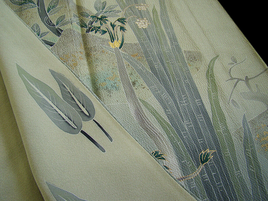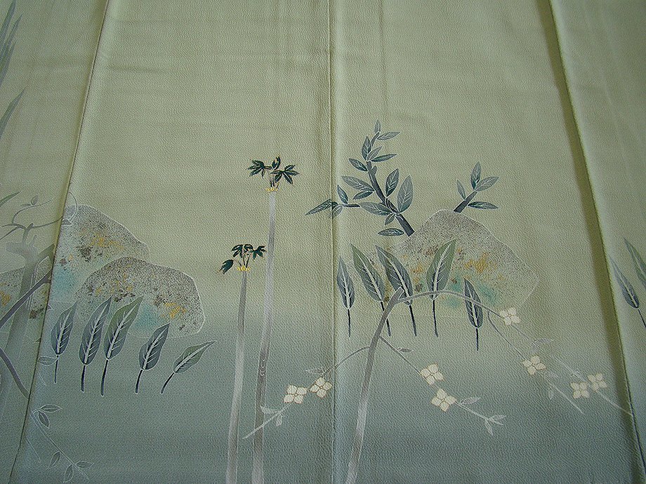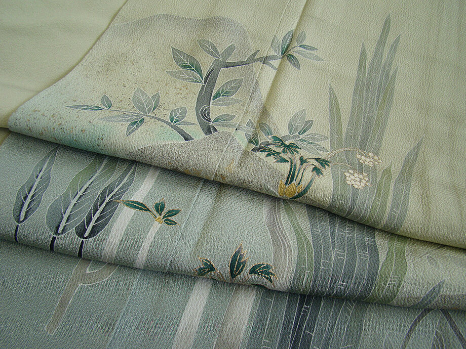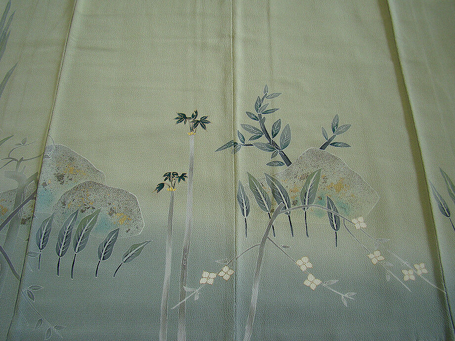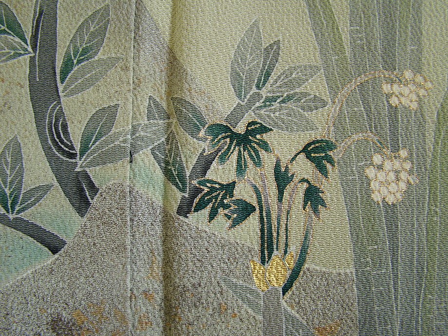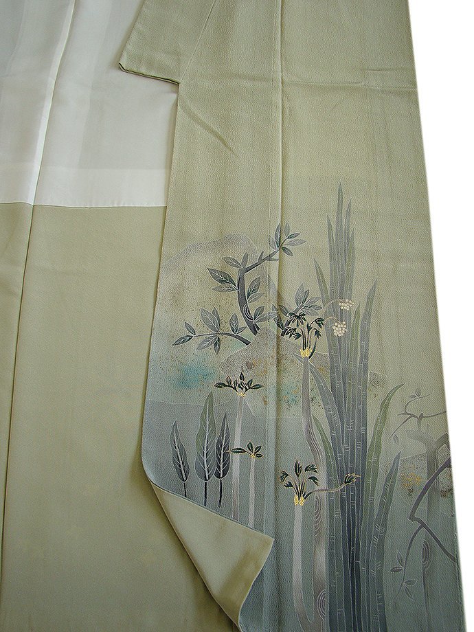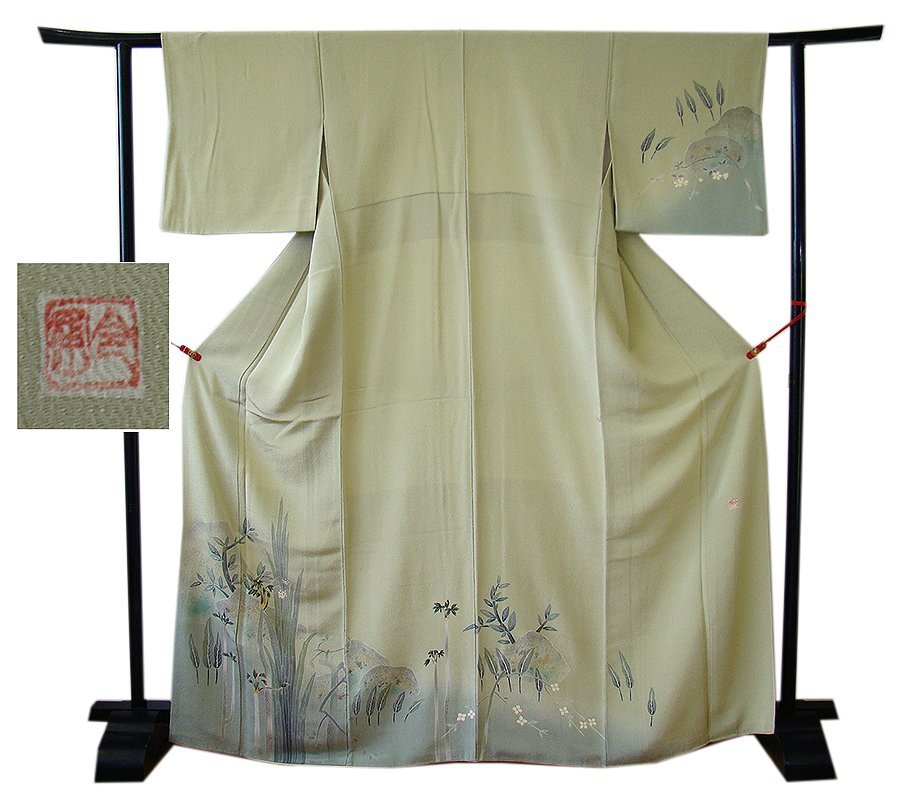 | 商品説明 | こちらのお品は「袷」ですので10月から5月までお召頂ければと思います。 とてもしなやかで柔らかな手触り良いぽってりとした重めの極上ちりめん地の生地、 柳鼠色地に立木や花木柄の染柄に金彩加工仕立て、 八掛は共色に柄入り(正絹)、作家の落款入り、幅広い年代の方にお召頂けます。 |