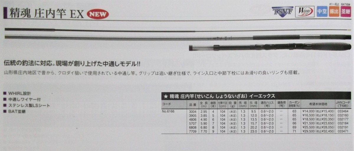 伝統の釣法に対応。現場が創り上げた中通しモデル!!山形県庄内地区で昔から、クロダイ狙いで使用されている中通し竿。グリップは追い継ぎ仕様で、ライン入口と中節下栓には糸滑りの良いリングも搭載。製品の詳細は、画像でご確認ください。*ご注意!現在、カタログ表示価格より値上がりしておりますので、ご了承ください。SPECIFICATION仕様■WHIRL設計■中通しワイヤー付■ステンレス製LSシート■BAT並継*当店からのお知らせです。(取引のトラブル防止のために、ご面倒でも是非お読みくださるようにお願いします) 当店は毎週水曜日と臨時休業日の場合は、業務全般が休止します。(一般業務の対応とメールなどの通信連絡も休止となりますから予めご了承ください。なお、営業日の対応時間は、通常でAM10時からPM7時までとなっております。また、商品の発送締め切り時間は午後3時となります) 商品の発送にかかる送料がお客様負担の場合で、送料と発送方法が特に明示されていない場合は、原則としてヤマトの宅急便で送りますので、当店から送料の案内を別途に差し上げますから、この案内に従いまして送料と商品代金のお支払いをお願いします。なお、発送方法が配送引き受け業者の都合や変更などで明記した内容と異なる場合がありますから予めご了承ください。(特に取り決めがない場合は、パソコンでの商品発送のシステム上、送料の着払いや代金引換には対応しておりませんのでご了承ください) 荷姿サイズは商品説明にて表示してあります。また、送料の料金表もリンクしておりますが、もし記載漏れなどで判らない場合は、予め質問でも対応しますが、ヤマトの料金表も参考にしてください。 送料無料商品の場合は、ポスト投函便で送ることが多くなりますので、配達の日時指定ができません事と、配送業者の都合で、配達が日数的に遅くなる場合がありますので、あらかじめご了承ください。 *ヤマトの料金表アドレスです。 http://www.kuronekoyamato.co.jp/estimate/minamitohoku.html 最近、業務が込み入っております関係で、メールでの通信連絡や商品の発送業務につきまして、できる限り早めの対応を心がけておりますが、お待ちいただく場合がありますので予め何卒ご了承ください。 お買い上げ後は、オーダーシートに必要事項を記載の上、当店宛に送信してください。(お客様の連絡がないままに48時間を経過した時や、代金の決済が5日間以内に成されない場合は、お買い上げの権利が消滅しますからご了承ください) なお、特に取引を急ぐ場合などは、お買い上げの前に質問コーナーなどで、当店における対応の可否を確認の程、お願いします。(質問の回答が遅い場合はその他の対応も遅くなる可能性がありますから、あしからずご了承ください) 行き違いなどでお買い上げいただいた商品が品切れになる場合が想定されます。 品切れの場合には、納品をお待ちいただくか、代替品を提案するなどの手配はいたしますが、手配がつかない場合には、お客様にご負担をかけない形で、当店の責任において取引を終了させていただく事がありますから、このような場合には、ご理解とご了承をお願いします。 使用されている画像には、実物内容と合致しない場合がありますので、画像だけで判断しないで、説明を確実にご覧いただきます事をお願いします。 合致しない一例としましては *画像の商品数量と対象品の数量が異なる。(画像より実数が多い場合と少ない場合があります) *画像の商品サイズと対象品のサイズが異なる。 *画像の商品カラーと対象品のカラーが異なる。 概ね以上の内容が考えられますが、出品の便宜上、画像を複数の出品物と共有したり、同じ商品でも、商品のサイズや数量などが違う場合などが本件に該当すると思いますので何卒ご了承ください。 *商品を発送してからの返品は出来ませんから、当然ですが使用後の返品も出来ませんのでご了承ください。 ただし、サイズの交換希望などで、当店で認めた場合に限り交換出来ますが、送料などの諸経費はお客様の負担になります。 *当店では出荷時に確実な検品を行い商品を発送しますので、商品到着後はお客様においても商品の確認を即時にお願いします。万が一、破損、あるいは不良ヶ所があった場合、運送時の事故と思われます場合も含めまして、至急に当店まで連絡下さるようお願いします。(連絡が遅れますと、適切な対応が出来ない事があります) *初期不良品などの場合は、同じ商品と交換します。(同じ商品がない場合に限り、代替え品もしくは返金にて対応します) *メーカー保証のある商品は、通常使用において支障が発生した場合、発売メーカーとの連携により誠意をもってアフターサービスの対応をします。(保証内容と期間は、メーカーの定めた規定に従います) 以上は取引上のお約束ですから、何卒ご理解ご了承をお願いします。