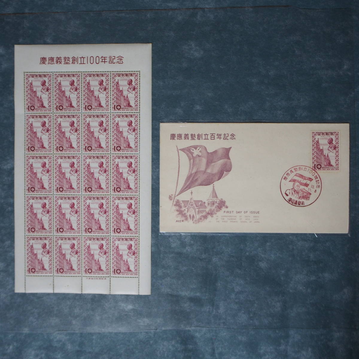 状態良好 !! 1958.11.8. 発行「慶應義塾創立100年記念 ( 塾者と福沢諭吉銅像 )」未使用 20枚シートと「初日カード」 セット ( 管理番号 1 )