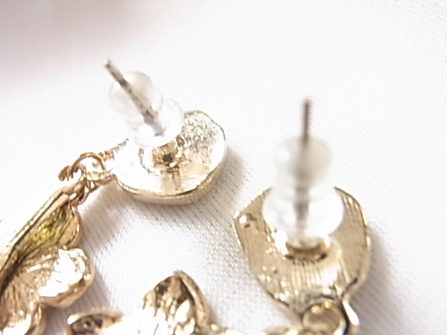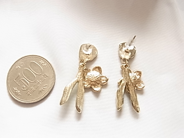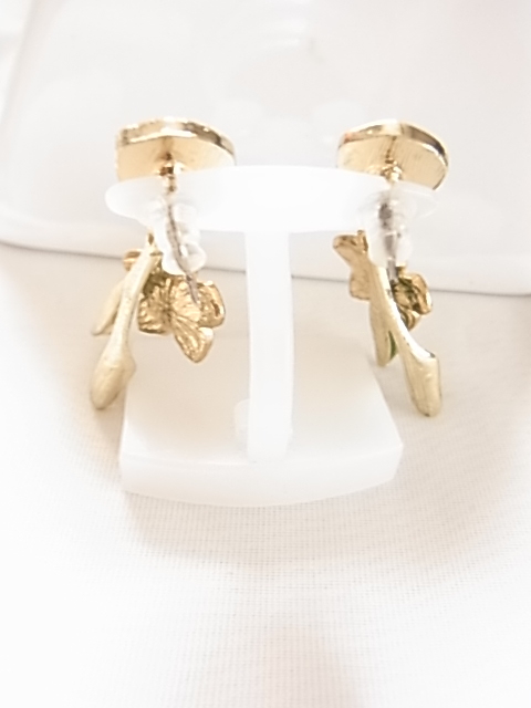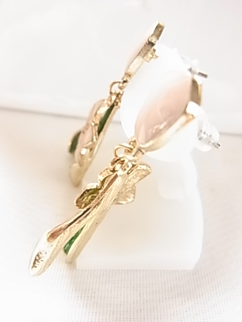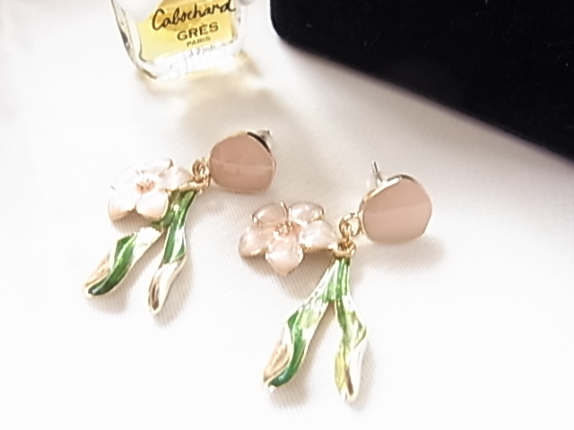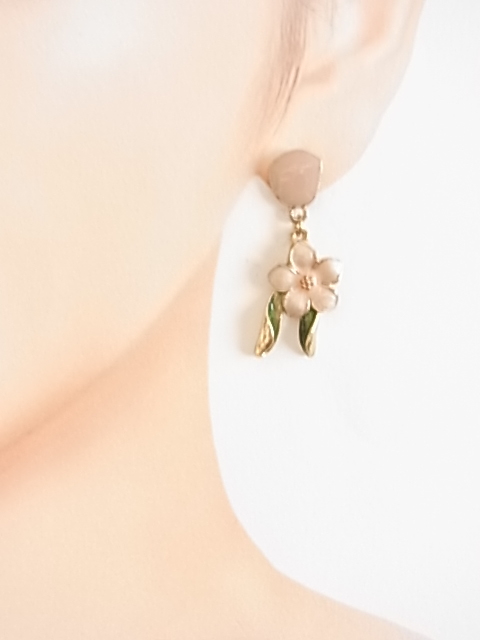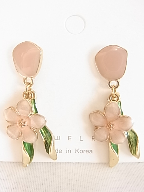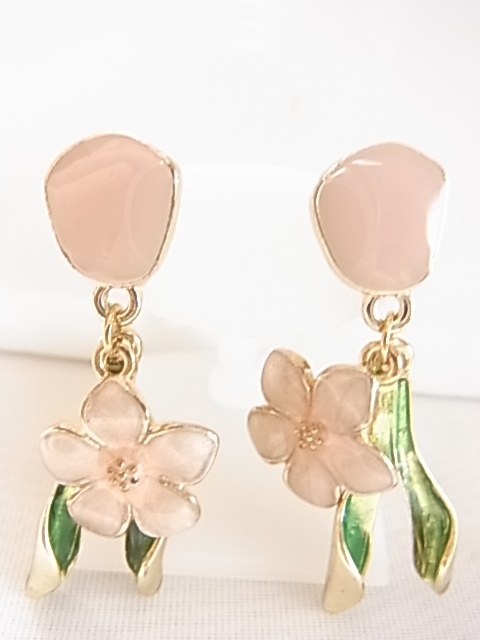 未使用フレッシュピンクの可憐なお花にヴェルディグリの葉っぱが耳元で揺れてキュートで可愛い エナメル装飾 シリコンキャッチピアス♪
