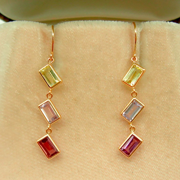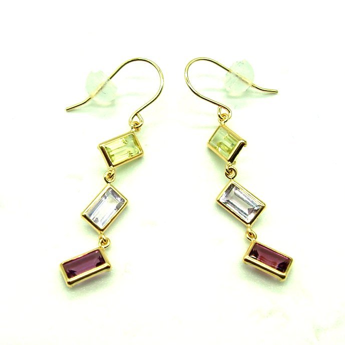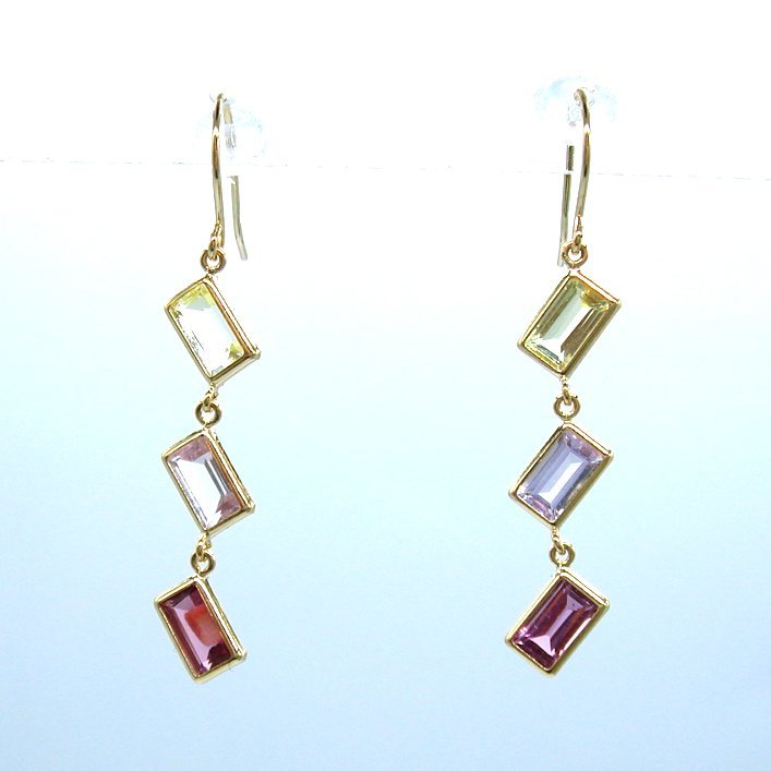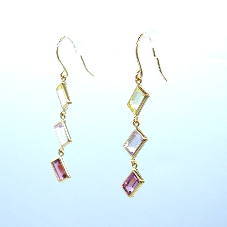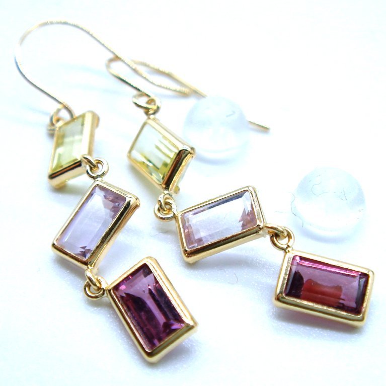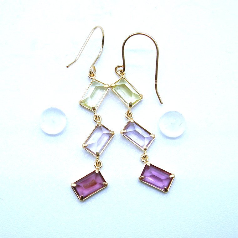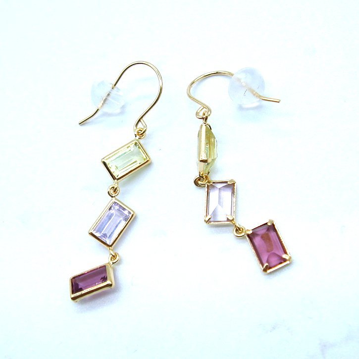 黄色(レモンクォーツ)・青紫(アメジスト)の水晶系の石に加えて赤紫のロードライトガーネットと合わせて3色の色合いを楽しめるピアス。