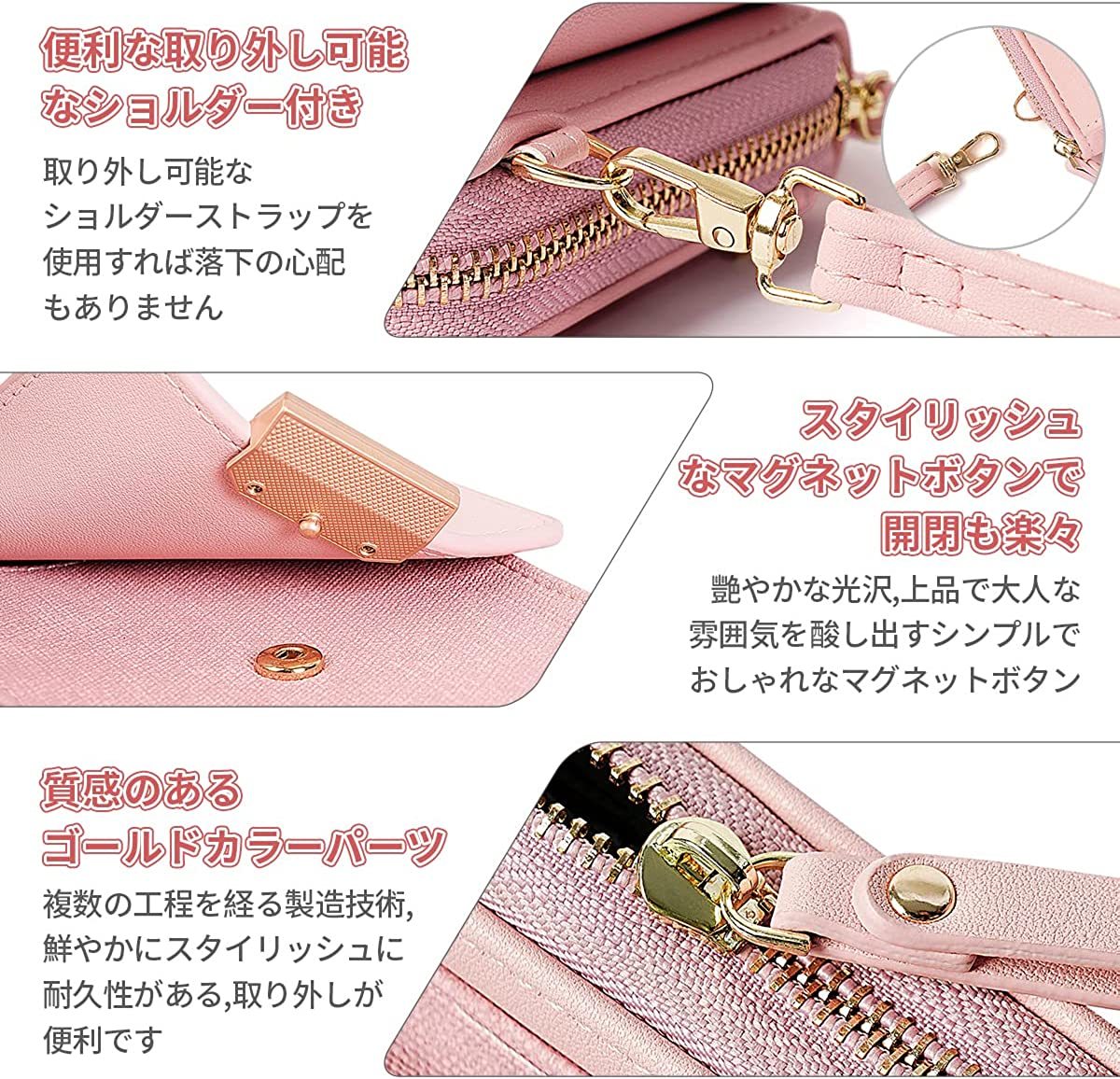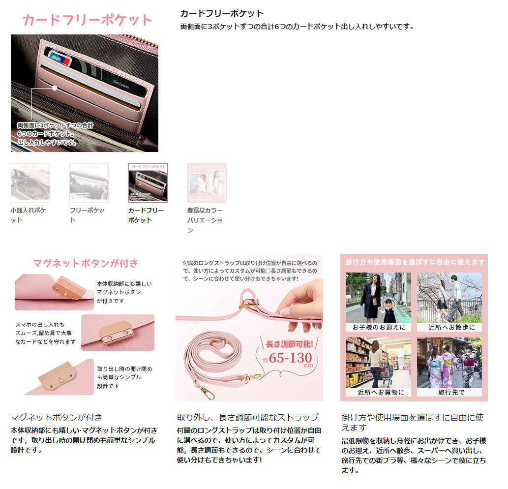 カラビナを外すだけでストラップを取り外せます。カバンに入れたい時やハンドブックとして使えたい時はすごく便利。ゴールドパーツが上品なアクセントに・ファスナー部分にさりげないハートで可愛さUP。ファスナーとマグネットの留め具で盗難防止にも・ 柔らかくて傷が目立ちにくい。