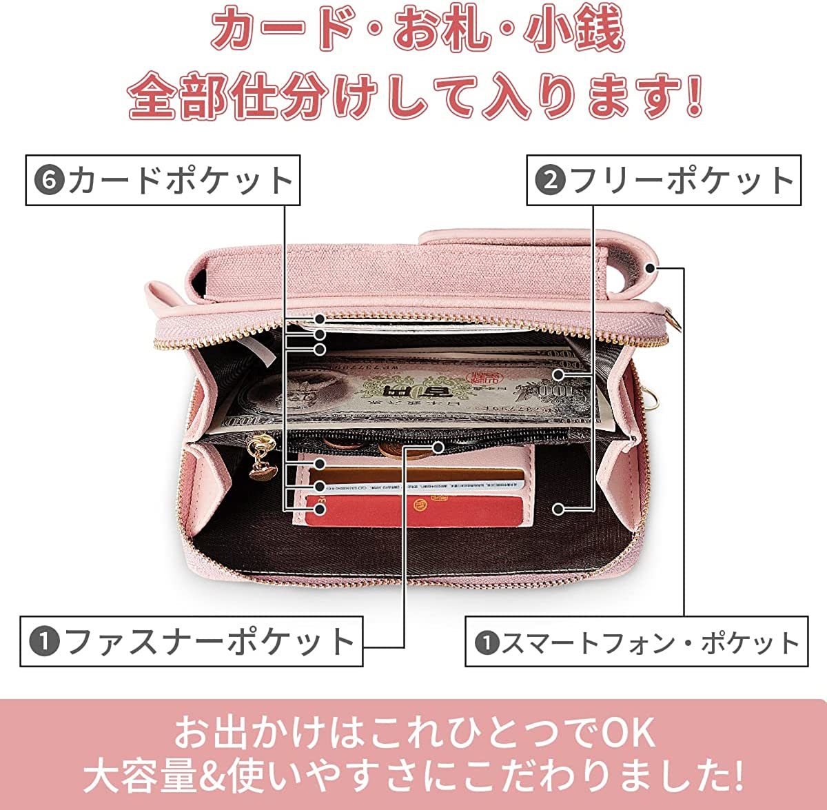 小銭が入るファスナーポケットとお札が収まる2っのプンポケット、カード収納が6ヶ所あります。沢山なカード、現金、小銭、切符すのでのカードはこちらに入れても,メイン収納はマチ付きなので、リップや鍵などの小物を入れていただけます。お財布やポーチとして使用すればちょつとした外出にもとっても便利