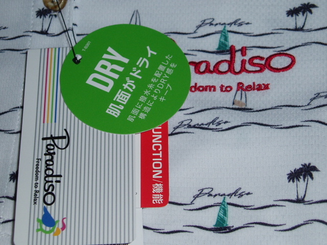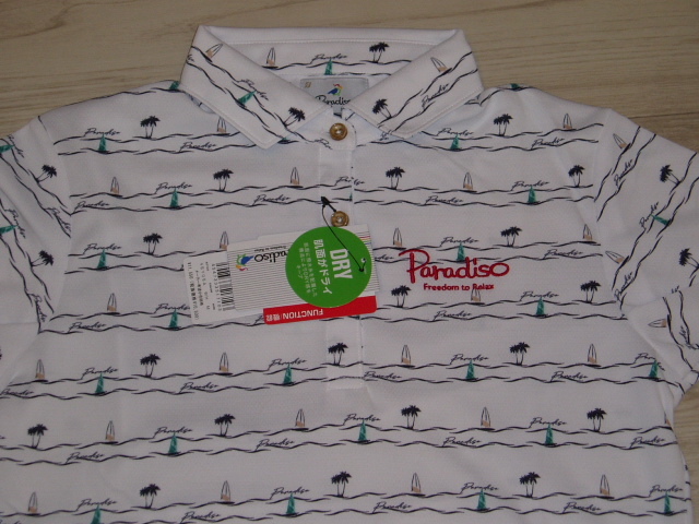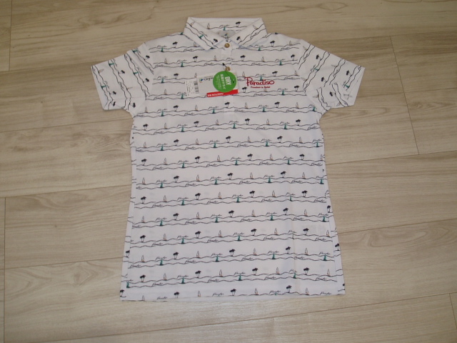 Paradiso(パラディーゾ)ゴルフシャツ 半袖台付共衿シャツ4SY05A レディース 新品です。税込み定価:11,550円 レディースのSサイズです。 手書き風のマリン柄が特徴の半袖シャツ。 リゾート満載の総柄シャツで他の人と差をつけて!汗をかく季節には嬉しい肌面を常にサラサラな状態に保つ機能付き。 日中の屋外でのプレーに欠かせないUVカット機能も備えています。 | |||