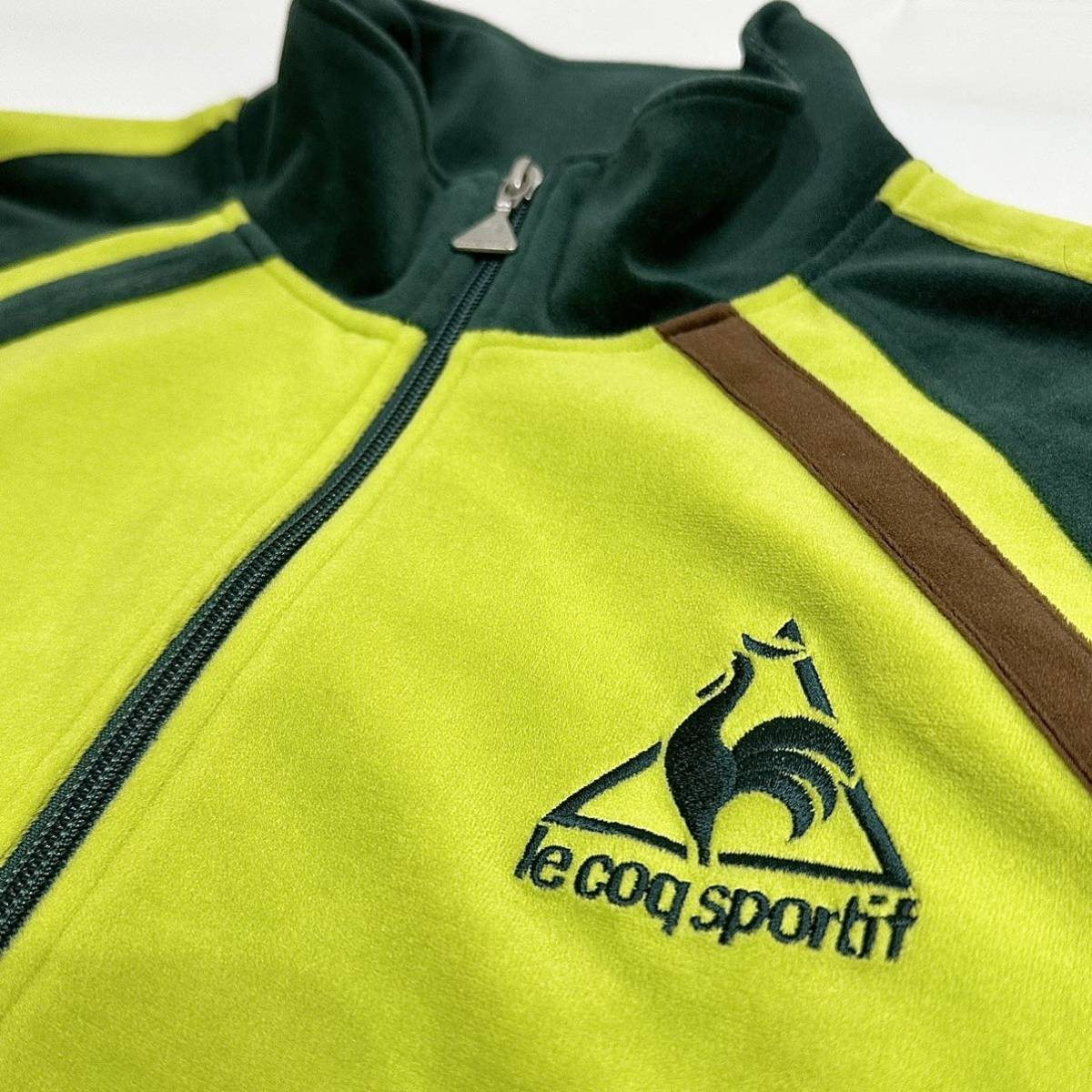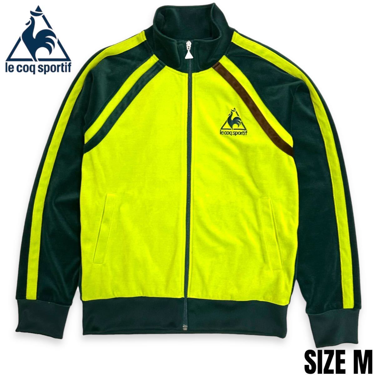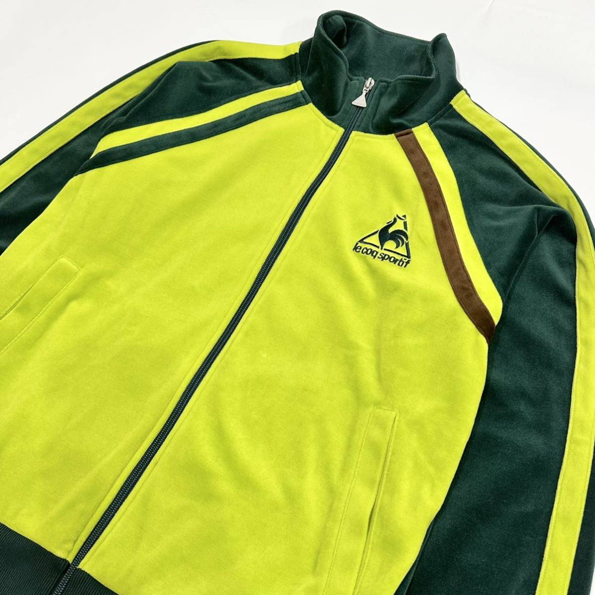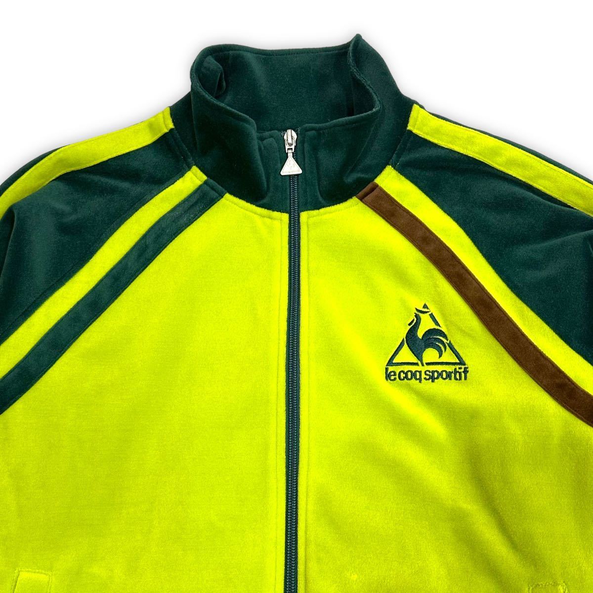稀少■ LECOQ SPORTIF (ルコック スポルティフ) ロゴ 刺繍 サイドライン 長袖トラックトップ ベロア ジャージ 緑黄 M アメカジ 古着 レトロ