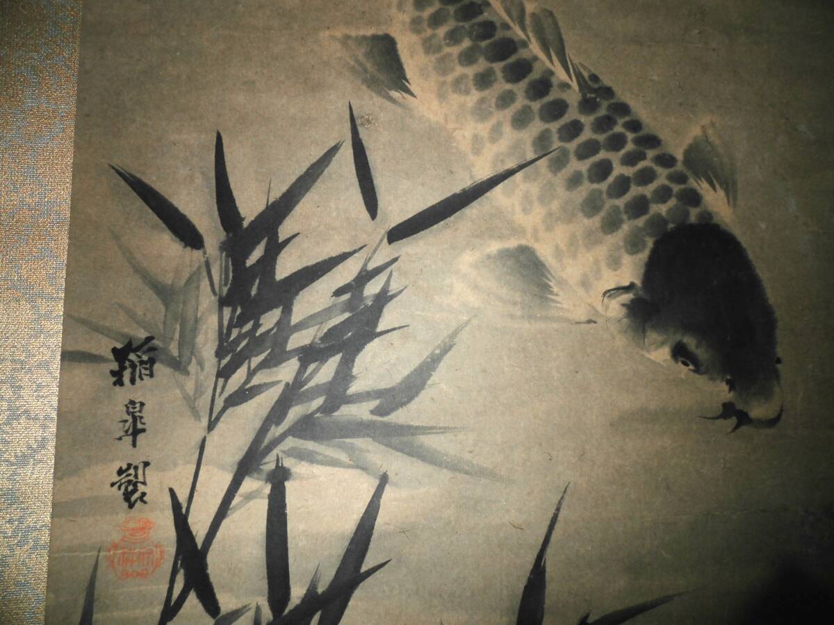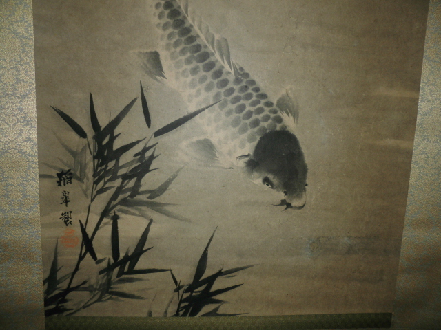 【模写】 黒田稲皐 鯉 掛け軸です。因幡鯉の図。箱はありません。表装のコンディションがとても良く、手をかけずにこのままご愛蔵いただけます。綺麗な鯉の掛軸をお探しの方に最適です。もちろん、人の手で書かれた一点物日本画掛軸です。